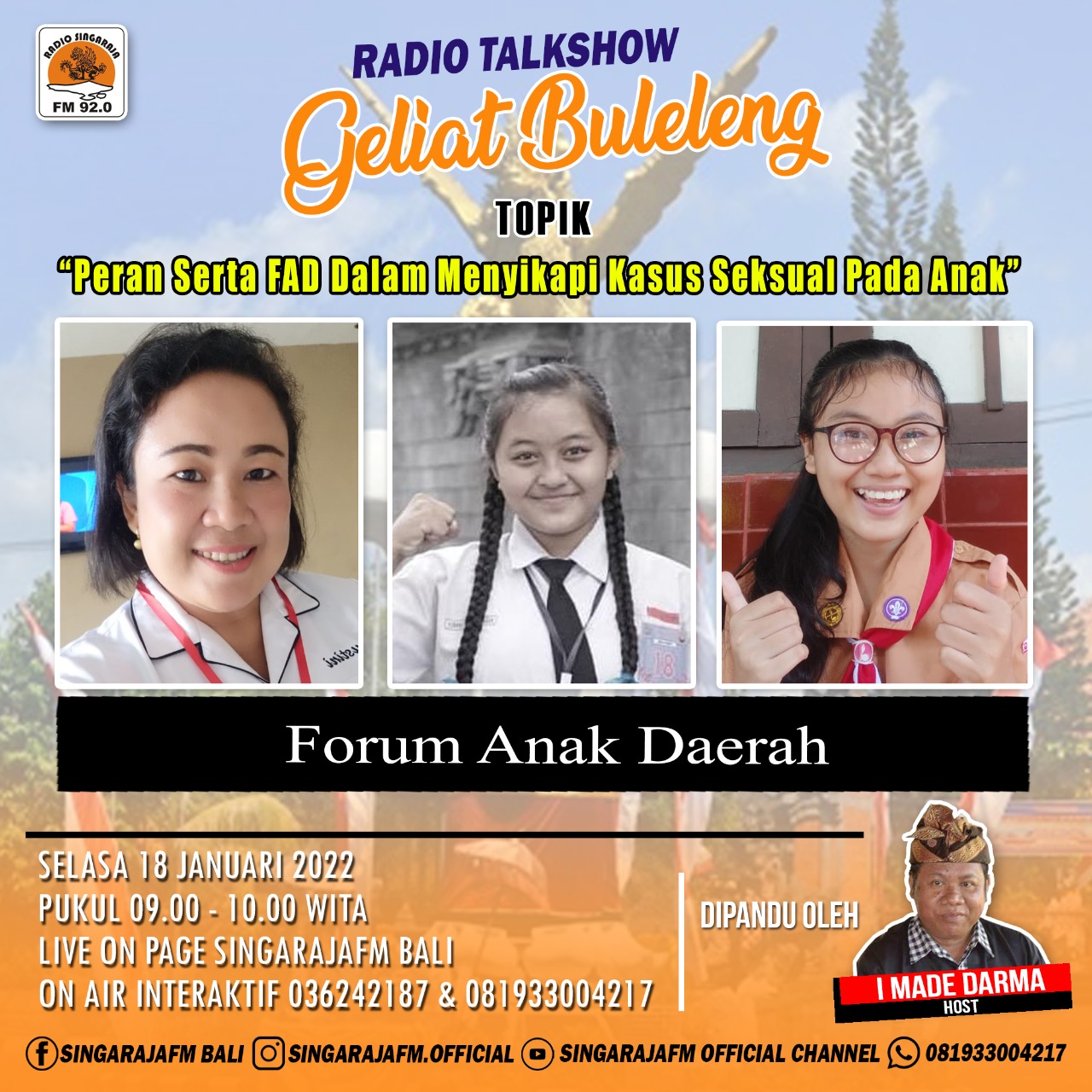 Geliat Buleleng dengan topik "Peran Serta FAD Dalam Menyikapi Kasus Seksual Pada Anak" dengan narasumber Putu Agustini, SST.Keb selaku Ka. Bid. Perlindungan Perempuan&Anak Dinas PPKBPP-PA Kabupaten Buleleng bersama Forum Anak Daerah yang dipandu pramusiar I Made Darma, live on page Singaraja FM Bali.