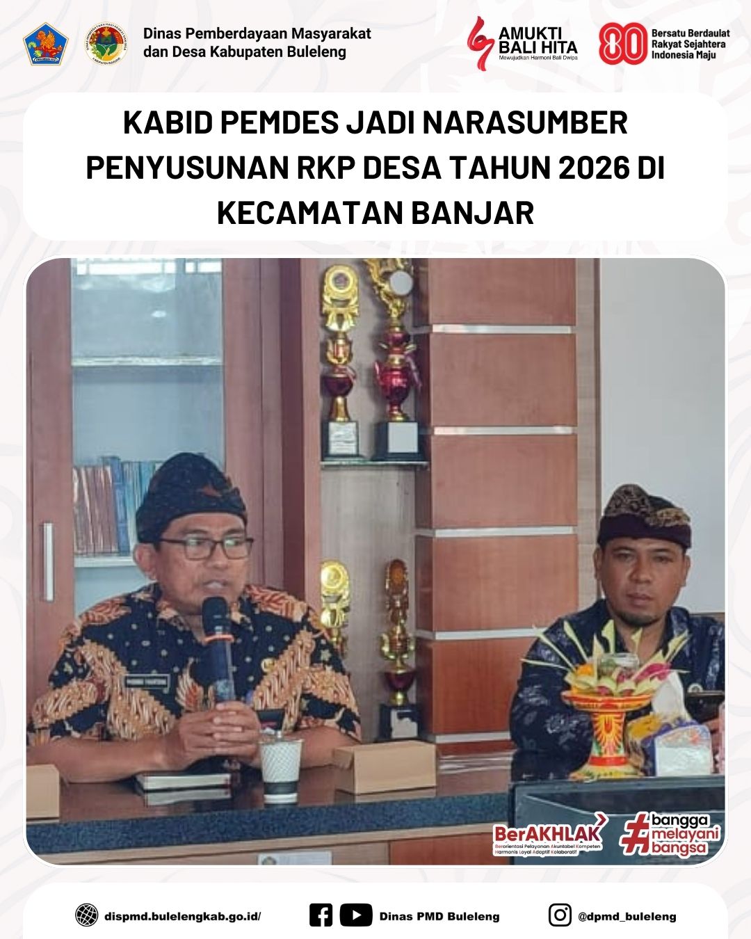 Buleleng, 28 Agustus 2025 - Kabid Pemerintahan Desa (Pemdes) Dinas PMD Kabupaten Buleleng, Madong Hartono, menghadiri undangan sebagai narasumber dalam kegiatan Rapat Penyusunan Rencana Kerja Pemerintah (RKP) Desa Tahun 2026 yang dilaksanakan di Aula Kantor Camat Banjar.