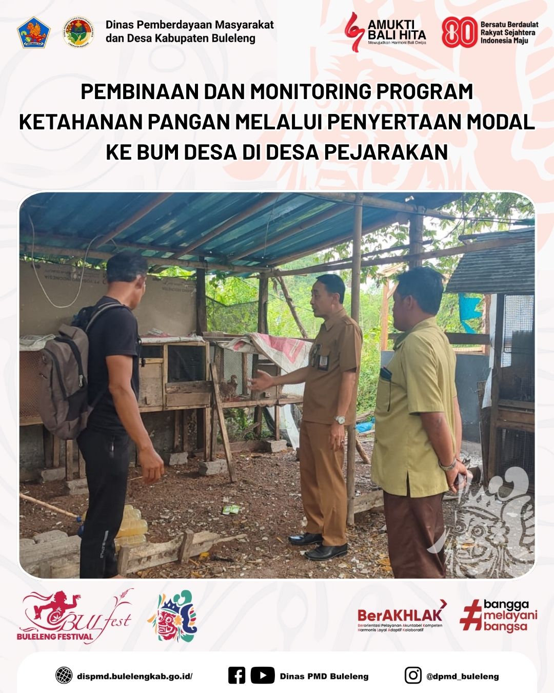 Buleleng, 4 Agustus 2025 - Dinas Pemberdayaan Masyarakat dan Desa (PMD) Kabupaten Buleleng melalui Bidang Pemerintahan Desa (Pemdes) melaksanakan kegiatan Pembinaan, Monitoring dan Evaluasi pelaksanaan program ketahanan pangan desa melalui skema penyertaan modal ke Badan Usaha Milik Desa (BUM Desa), bertempat di Kantor Perbekel Desa Pejarakan.