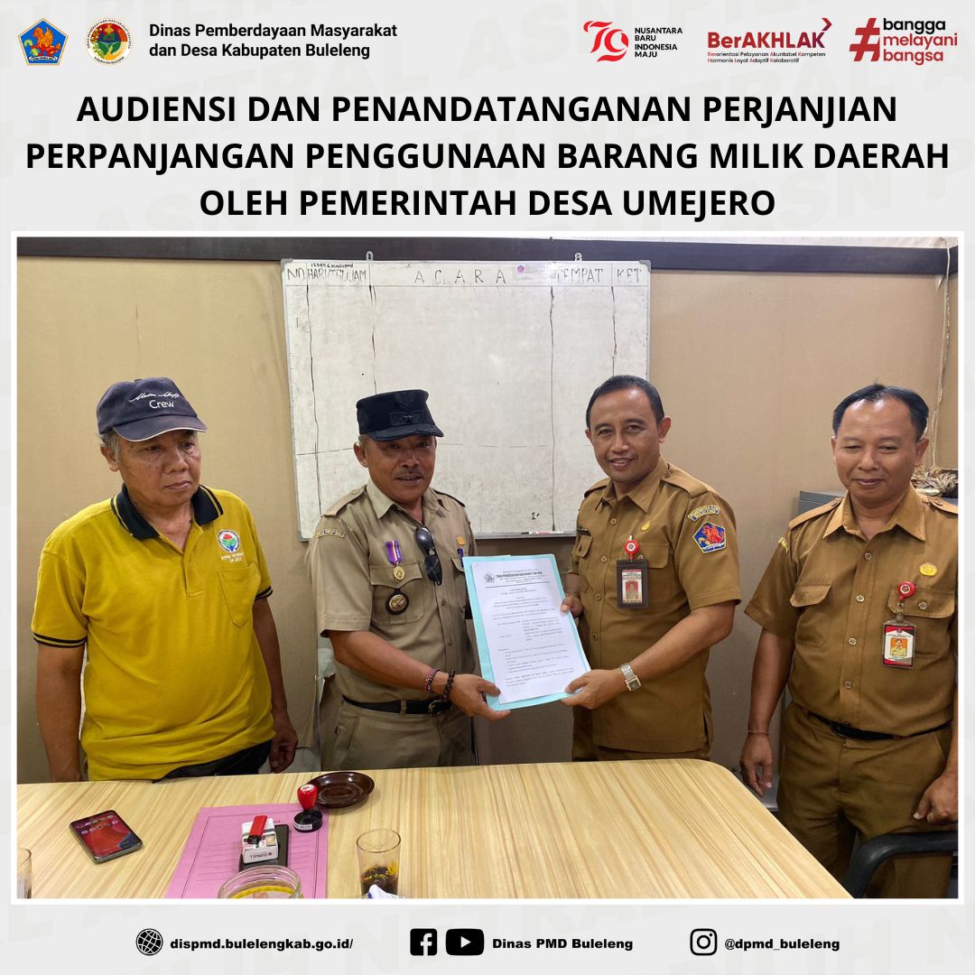 Buleleng, 23 Desember 2024 — Bertempat di Ruang Rapat Kepala Dinas Pemberdayaan Masyarakat dan Desa (PMD) Kabupaten Buleleng, Plt. Kepala Dinas PMD, Drs. Made Supartawan, didampingi staf pengurus barang, Nyoman Kajeng, menerima audiensi dari Pemerintah Desa Umejero. Pertemuan ini dihadiri oleh Perbekel Umejero, Gede Adis, yang didampingi oleh Sekretaris Desa, Nyoman Arya, dengan agenda utama penandatanganan perjanjian perpanjangan penggunaan barang milik daerah berupa tanah dan bangunan kepada Pemerintah Desa Umejero.