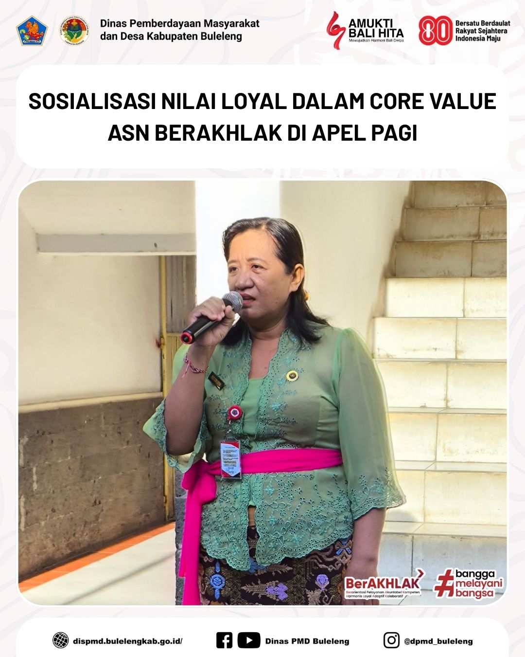 Buleleng, 2 Oktober 2025 - Dinas Pemberdayaan Masyarakat dan Desa (PMD) kembali melaksanakan sosialisasi nilai-nilai atau core value ASN BerAKHLAK dalam apel pagi yang berlangsung di halaman kantor Dinas PMD. Kegiatan ini diikuti oleh seluruh pegawai Dinas PMD dan dipimpin oleh Kabid Lembaga Kemasyarakatan Desa, Adat, dan Usaha Ekonomi Masyarakat (LKDA-UEM), Ni Made Banu Deviati.