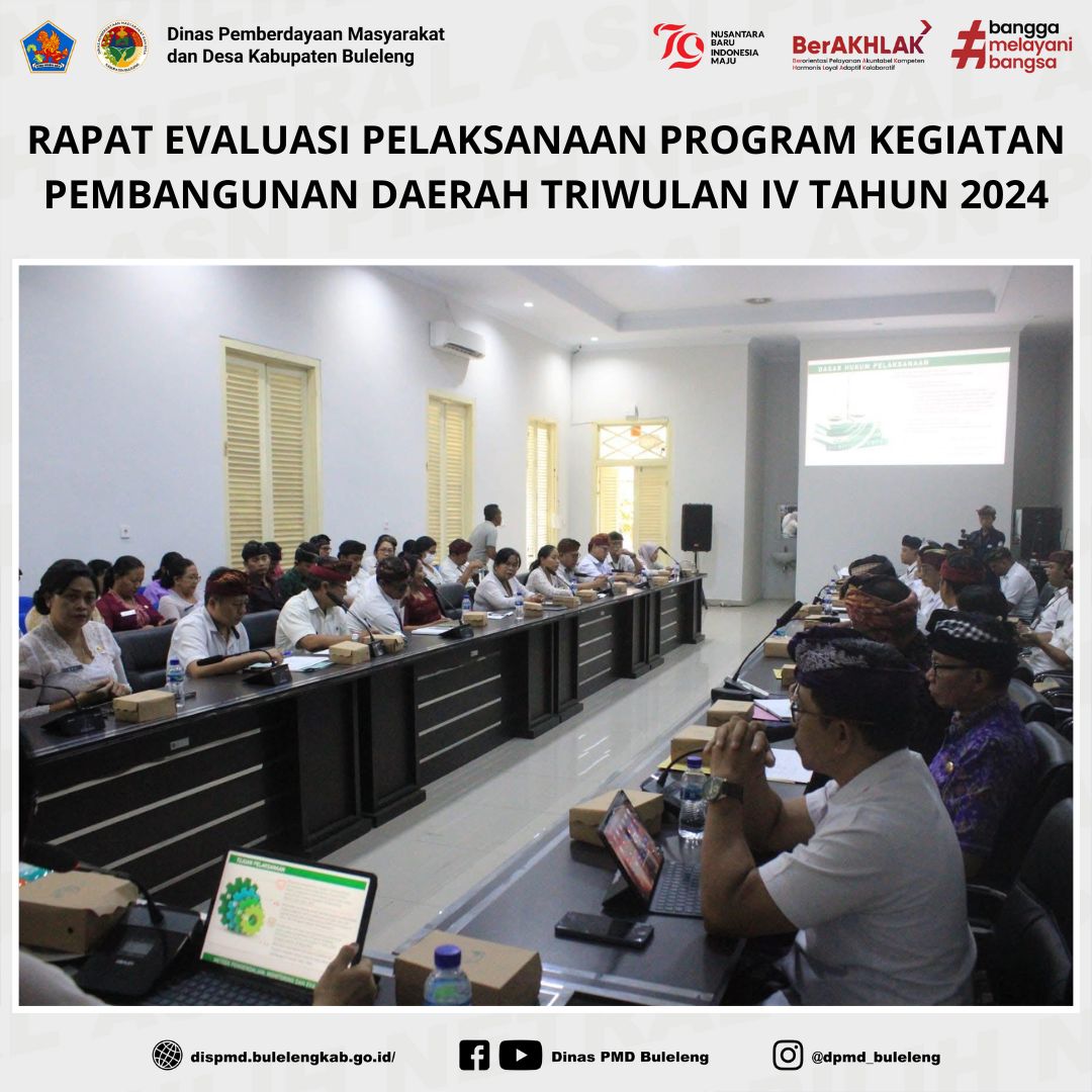 Buleleng, 19 Desember 2024 - Dinas Pemberdayaan Masyarakat dan Desa (PMD) Kabupaten Buleleng, yang diwakili oleh Sekretaris Dinas (Sekdis) Gede Sasnita Ariawan, menghadiri Rapat Evaluasi Pelaksanaan Program Kegiatan Pembangunan Daerah Triwulan IV Tahun 2024. Rapat ini membahas capaian bulan November dan bertempat di Ruang Rapat Utama Bappeda Kabupaten Buleleng. Rapat dipimpin langsung oleh Asisten II Sekretariat Daerah (Setda) Buleleng, Ni Made Rousmini, didampingi Kepala Badan Perencanaan Pembangunan Daerah (Bappeda) Buleleng Putu Ayu Reika Nurhaeni.