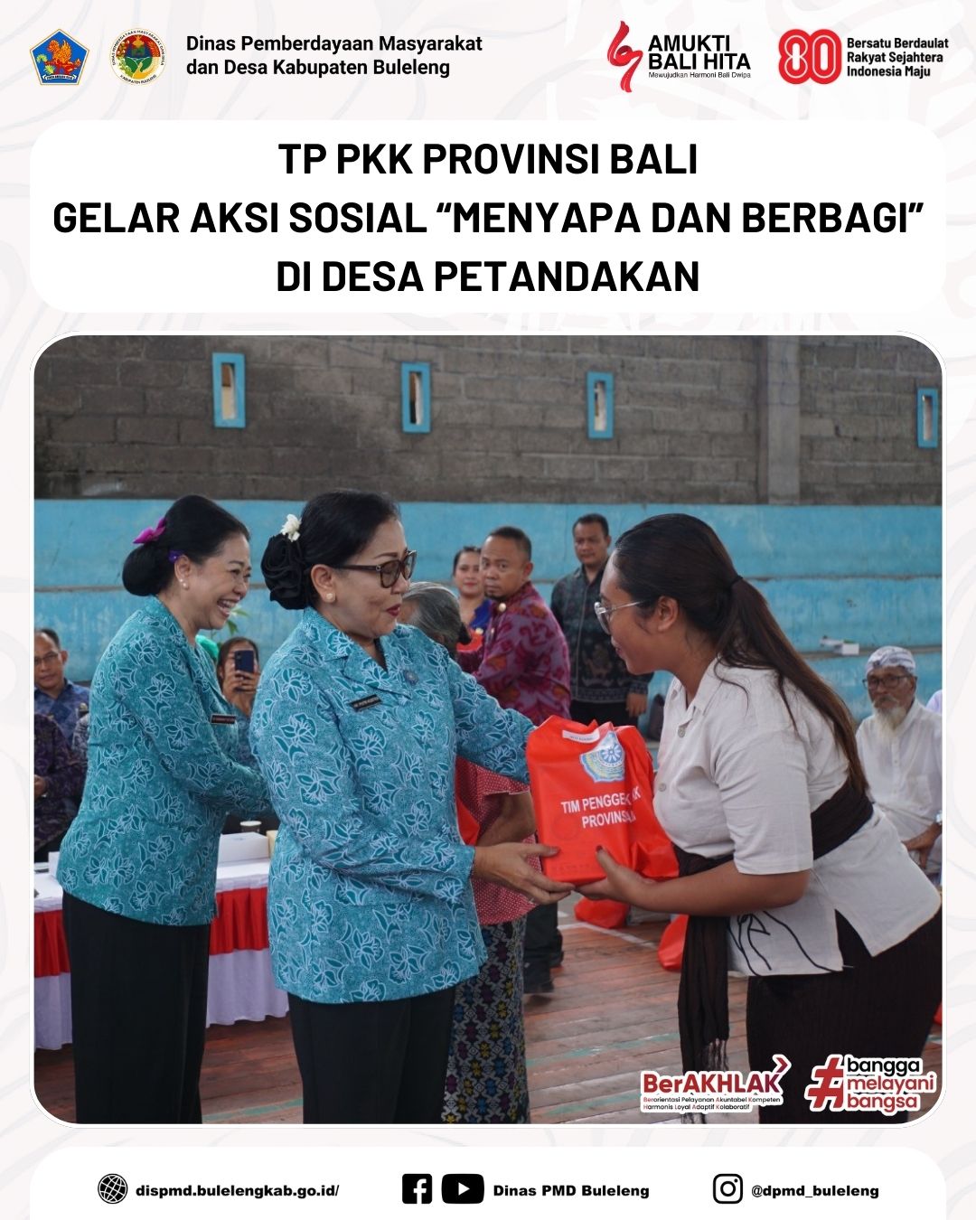 Buleleng, 2 Desember 2025 - Dinas Pemberdayaan Masyarakat dan Desa (PMD) Kabupaten Buleleng bersama Tim Penggerak PKK Kabupaten Buleleng mendampingi pelaksanaan kegiatan Aksi Sosial “Menyapa dan Berbagi” yang digelar oleh Tim Penggerak PKK Provinsi Bali di Gedung Serbaguna Desa Petandakan, Kecamatan Buleleng, pada Selasa (2/12).