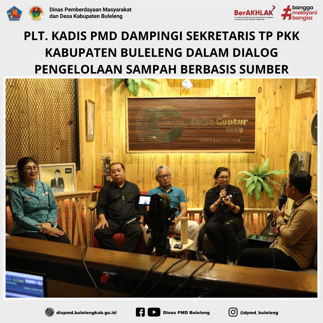 Buleleng, 23 Maret 2025 - Plt. Kepala Dinas Pemberdayaan Masyarakat dan Desa (PMD) Kabupaten Buleleng, Nyoman Widiartha, turut hadir mendampingi Sekretaris Tim Penggerak Pemberdayaan Kesejahteraan Keluarga (TP PKK) Kabupaten Buleleng, Ny. Hermawati Supriatna, dalam kegiatan dialog interaktif yang membahas Pengelolaan Sampah Berbasis Sumber di Radio Semeton Takdir, Desa Lokapaksa, pada Minggu (23/3). Dialog ini menghadirkan Ketua TP PKK Provinsi Bali, Ny. Putri Suastini Koster, serta Perbekel Desa Baktiseraga, I Gusti Putu Armada, sebagai narasumber.
