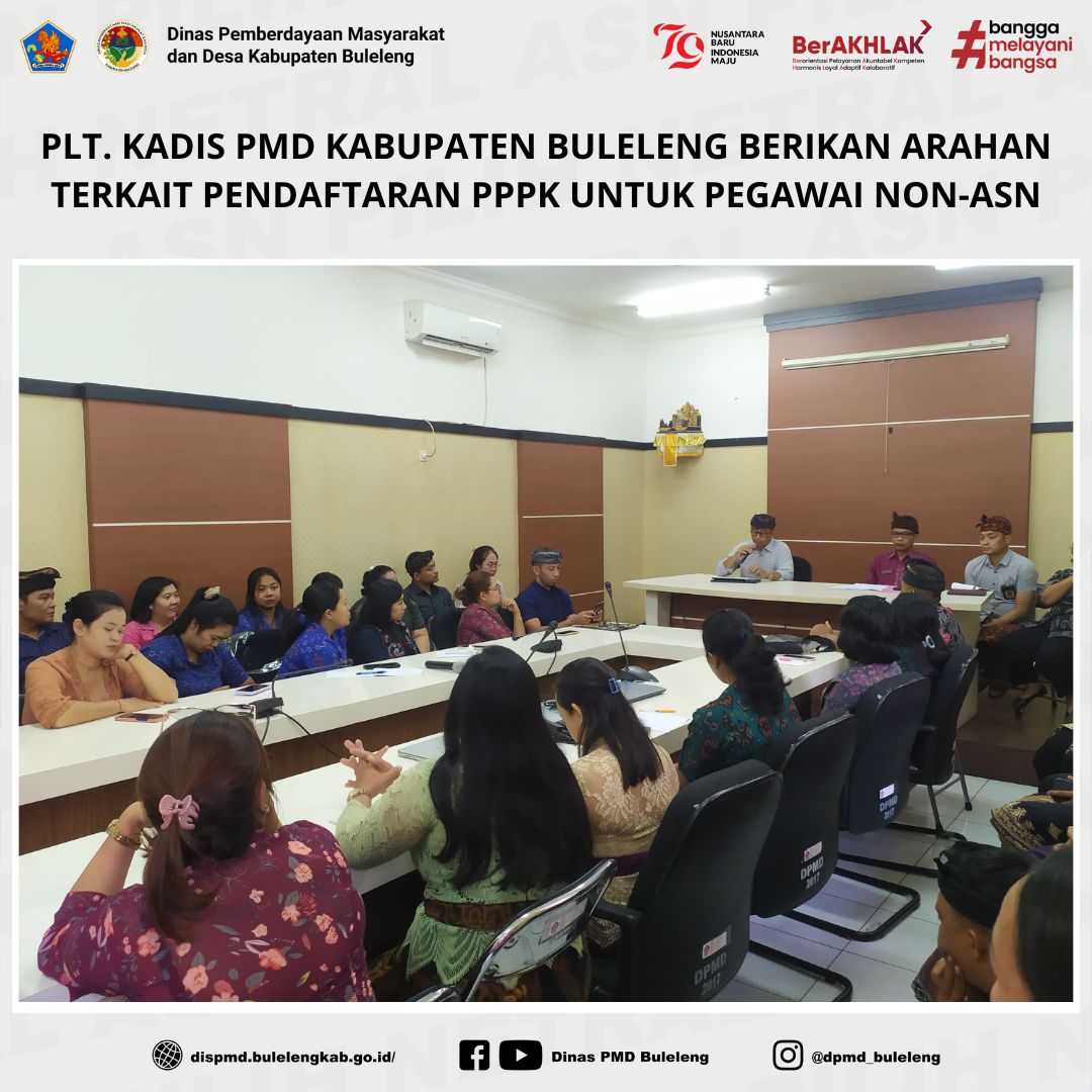Buleleng, 3 Oktober 2024 – Plt. Kepala Dinas PMD Kabupaten Buleleng, Made Supartawan, mengumpulkan para pegawai non-ASN di Dinas PMD dalam rangka memberikan arahan terkait proses pendaftaran Pegawai Pemerintah dengan Perjanjian Kerja (PPPK) yang berlangsung hingga 20 Oktober 2024. Kegiatan ini berlangsung di Ruang Rapat Dinas PMD dan didampingi oleh Sekretaris Dinas serta para Kepala Bidang.