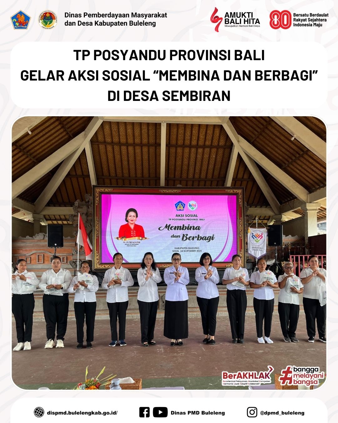 Buleleng, 24 November 2025 - Dinas Pemberdayaan Masyarakat dan Desa (PMD) Kabupaten Buleleng melalui Bidang Lembaga Kemasyarakatan Desa, Adat dan Usaha Ekonomi Masyarakat (LKDA-UEM) turut mendampingi pelaksanaan kegiatan Aksi Sosial “Membina dan Berbagi” oleh Tim Pembina Posyandu Provinsi Bali di Desa Sembiran, Kecamatan Tejakula, pada Senin (24/11).