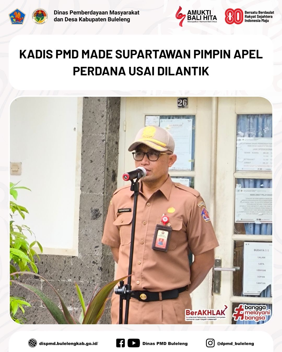 Buleleng, 27 Oktober 2025 - Kepala Dinas Pemberdayaan Masyarakat dan Desa (PMD) Kabupaten Buleleng, Made Supartawan, memimpin apel pagi perdana setelah resmi dilantik pada Jumat, 24 Oktober 2025. Apel berlangsung di halaman kantor Dinas PMD Kabupaten Buleleng dalam suasana mendung namun penuh semangat kebersamaan.