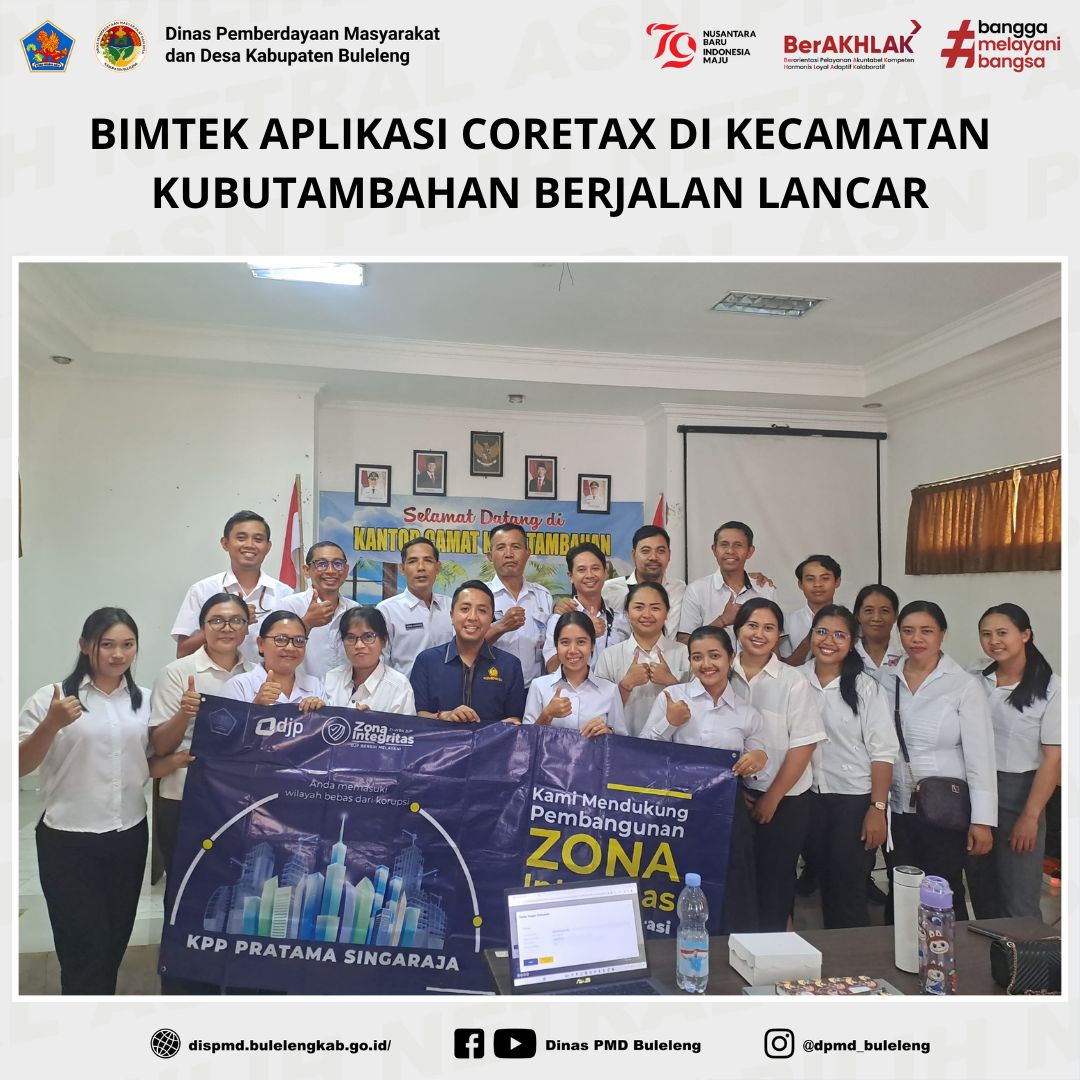 Buleleng, 12 Maret 2025 – Dinas Pemberdayaan Masyarakat dan Desa (PMD) Kabupaten Buleleng melalui perwakilan dari Bidang Pemerintahan Desa, Kadek Sadnyana, S.Sos., mendampingi pelaksanaan Bimbingan Teknis (Bimtek) terkait penggunaan Aplikasi CORETAX di Kecamatan Kubutambahan. Kegiatan ini berlangsung di Ruang Rapat Kantor Camat Kubutambahan dan diikuti oleh Bendahara Desa dari 13 desa di kecamatan tersebut.