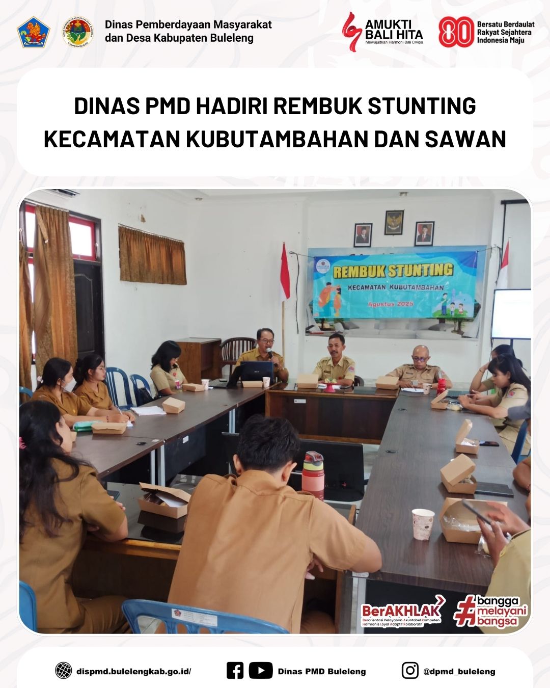 Buleleng, 25 Agustus 2025 - Dinas Pemberdayaan Masyarakat dan Desa (PMD) Kabupaten Buleleng melalui Bidang Lembaga Kemasyarakatan Desa, Adat, dan Usaha Ekonomi Masyarakat (LKDA & UEM) kembali hadir sebagai narasumber dalam kegiatan Rembuk Stunting Kecamatan yang diselenggarakan oleh Dinas P2KBP3A di Kecamatan Kubutambahan dan Kecamatan Sawan.