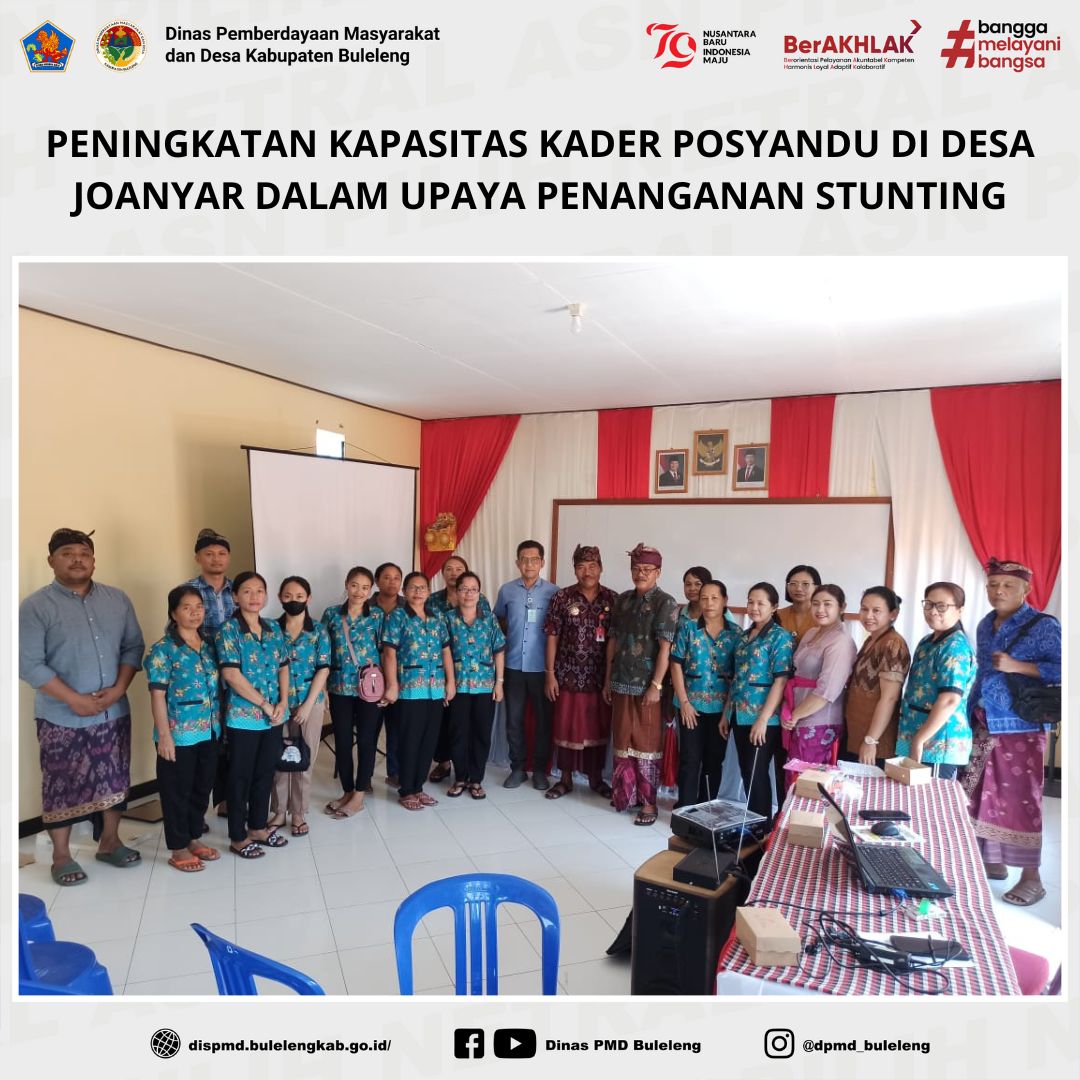 Buleleng, 24 Oktober 2024 - Dinas PMD Kabupaten Buleleng melalui Bidang Lembaga Kemasyarakatan Desa, Adat dan Usaha Ekonomi Masyarakat (LKDA-UEM), yang diwakili oleh Staf I Made Aryana, melaksanakan kegiatan peningkatan kapasitas kader Posyandu di Desa Joanyar, Kecamatan Seririt, pada Kamis, 24 Oktober 2024. Kegiatan ini dilaksanakan di Kantor Desa Joanyar, sebagai bagian dari upaya mendukung desa-desa lokus stunting tahun 2024.