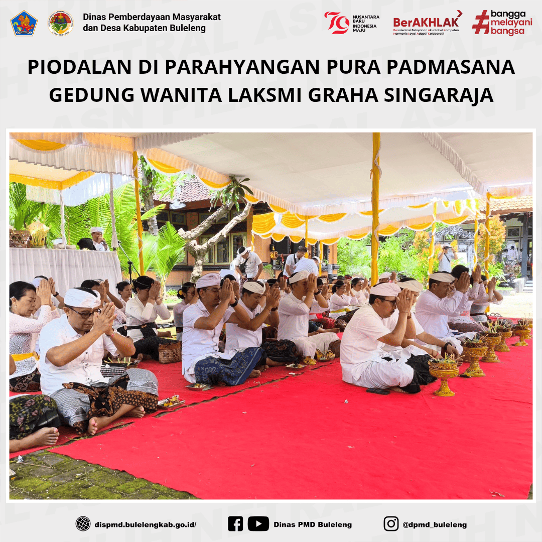 Buleleng, 8 Februari 2025 - Plt. Kadis PMD Kabupaten Buleleng Made Supartawan, hari ini menghadiri upacara Piodalan di Parahyangan Pura Padmasana Gedung Wanita Laksmi Graha Singaraja, yang dilaksanakan oleh Tim Penggerak PKK Kabupaten Buleleng bertepatan dengan Hari Raya Saraswati pada saniscara, wuku Watugunung, Sabtu 8 Februari 2025.