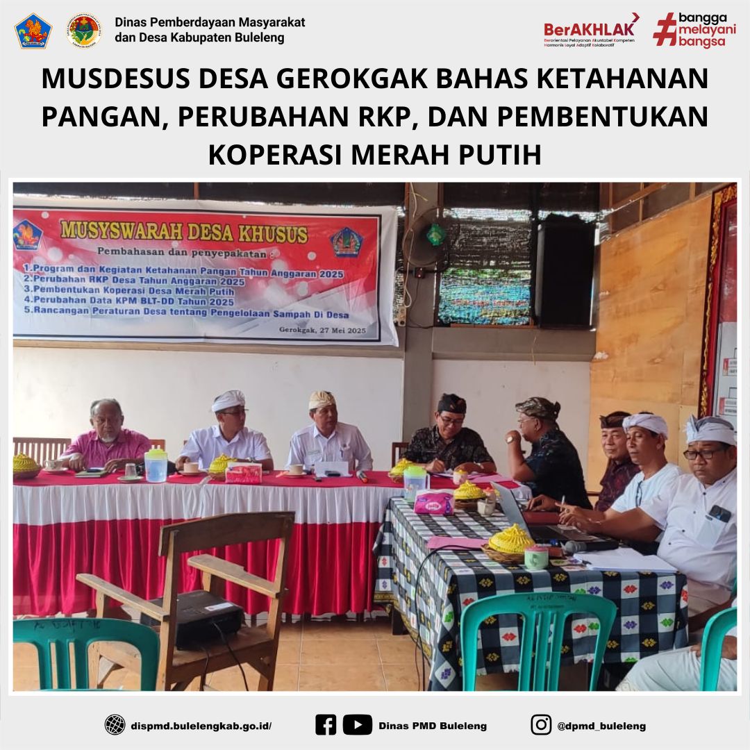 Buleleng, 27 Mei 2025 — Pemerintah Desa Gerokgak melaksanakan Musyawarah Desa Khusus (Musdesus) yang membahas sejumlah agenda penting, antara lain Program dan Kegiatan Ketahanan Pangan Tahun Anggaran 2025, Perubahan RKP Desa TA 2025, Pembentukan Koperasi Desa Merah Putih, Perubahan Data KPM BLT-DD Tahun 2025, serta Rancangan Peraturan Desa tentang Pengelolaan Sampah. Musdesus ini berlangsung di Aula Kantor Desa Gerokgak.