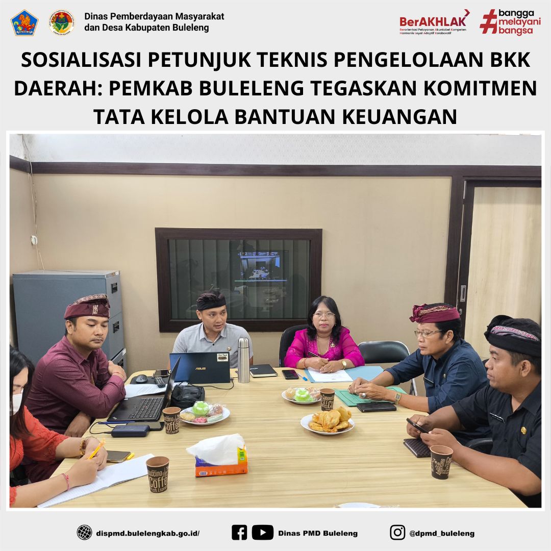 Buleleng, 10 April 2025 — Dinas Pemberdayaan Masyarakat dan Desa (PMD) Kabupaten Buleleng melalui Bidang Penataan dan Kerjasama Desa (PKD) menyelenggarakan Sosialisasi Petunjuk Pelaksanaan (Juklak) dan Petunjuk Teknis (Juknis) Pengelolaan Bantuan Keuangan Khusus (BKK) Daerah, Kamis (10/4). Kegiatan ini berlangsung secara hybrid dengan peserta daring melalui Zoom Meeting dan luring bertempat di Ruang Rapat Kepala Dinas PMD Kabupaten Buleleng.