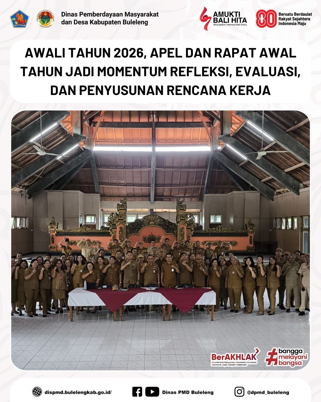 Buleleng, 5 Januari 2026 - Mengawali tahun 2026, jajaran Dinas Pemberdayaan Masyarakat dan Desa (PMD) melaksanakan apel pagi yang dirangkaikan dengan rapat awal tahun di halaman Gedung Wanita Laksmi Graha, Singaraja. Pemilihan lokasi ini memiliki makna tersendiri, mengingat Gedung Laksmi Graha direncanakan akan dibongkar karena berada di areal pembangunan titik nol Kabupaten Buleleng yang akan dimulai pada awal tahun 2026. Kepala Dinas PMD mengajak seluruh pegawai menjadikan kegiatan ini sebagai momentum terakhir untuk merenungi sejarah Gedung Laksmi Graha sebagai bagian dari aset Dinas PMD.
