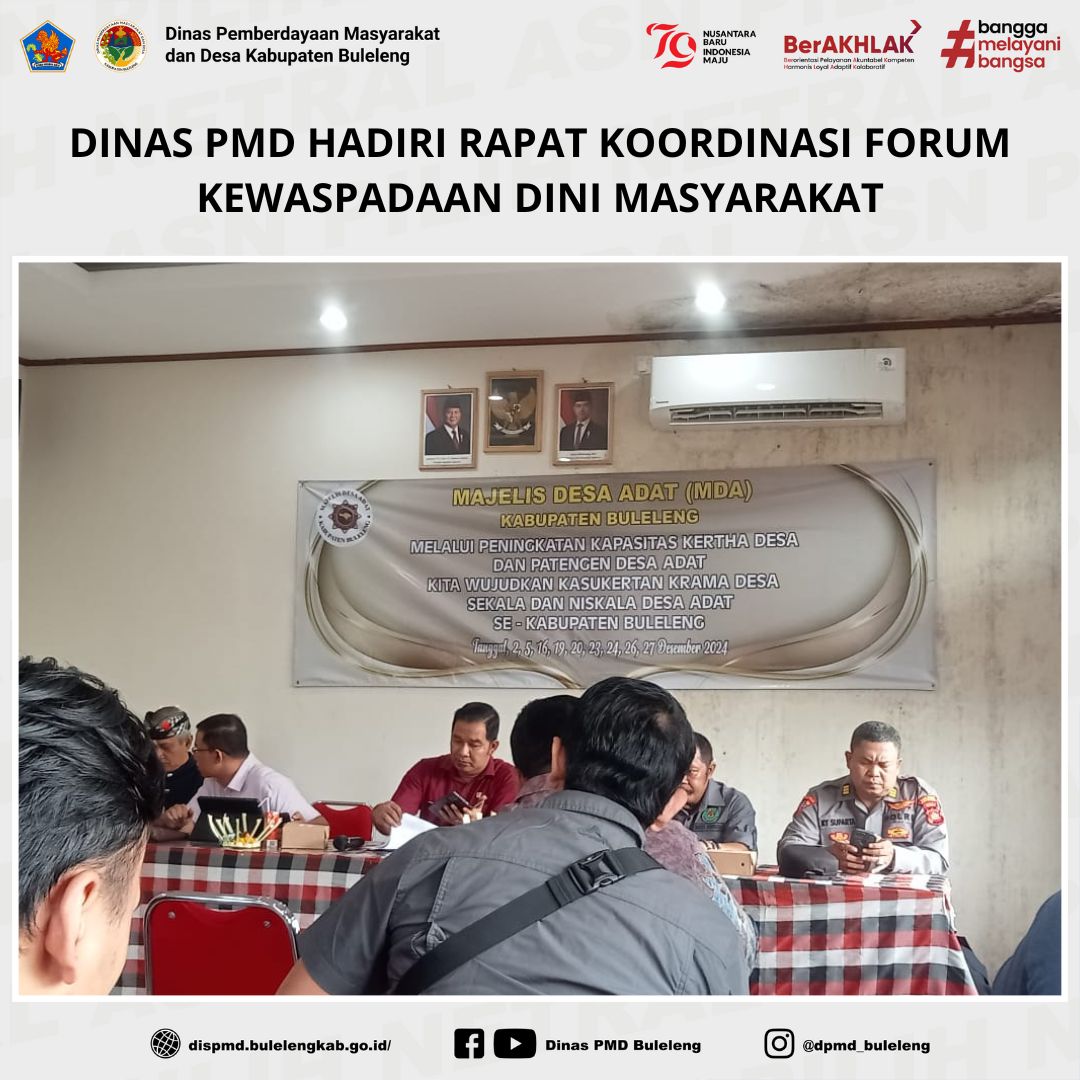 Buleleng, 31 Januari 2025 – Dinas Pemberdayaan Masyarakat dan Desa (PMD) Kabupaten Buleleng yang diwakili oleh Kasubbag Umum, Made Desi Widiarsini, SE., menghadiri Rapat Koordinasi Forum Kewaspadaan Dini Masyarakat Kabupaten Buleleng pada Jumat, 31 Januari 2025. Rapat ini berlangsung di Ruang Rapat Kantor MDA Kabupaten Buleleng dan dipimpin oleh Kepala Badan Kesatuan Bangsa dan Politik (BKBP) Kabupaten Buleleng.