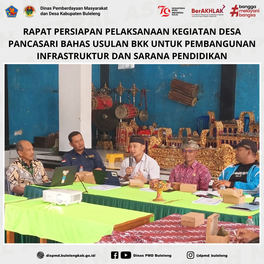 Buleleng, 7 November 2024 – Desa Pancasari menggelar Rapat Persiapan Pelaksanaan Kegiatan untuk membahas tiga usulan Bantuan Keuangan Khusus (BKK) yang telah tertuang dalam SK Bupati Buleleng Tahun 2024. Kegiatan ini dihadiri oleh Kepala Bidang Penataan dan Kerjasama Desa (PKD), I Rai Gede Arisudana, beserta staf di Bidang PKD. Bertempat di Kantor Perbekel Desa Pancasari, Musdes dihadiri oleh berbagai unsur terkait, termasuk perwakilan dari Dinas Pekerjaan Umum (PU), Perbekel Desa Pancasari, Sekretaris Desa, Ketua Badan Permusyawaratan Desa (BPD) Pancasari, Pelaksana Kegiatan Anggaran (PKA) Desa Pancasari, Tenaga Ahli (T.A) Kabupaten Buleleng, Tim Pelaksana Kegiatan (TPK), serta Pendamping Desa (PD) Desa Pancasari.