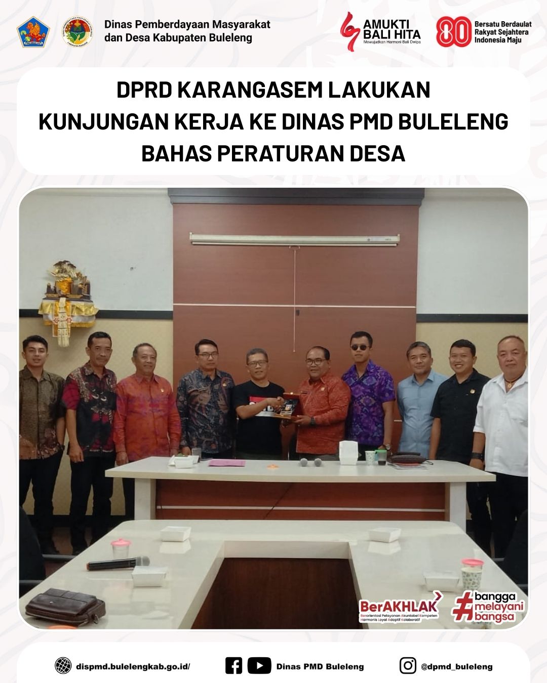Buleleng, 19 September 2025 - Plt. Kepala Dinas PMD Kabupaten Buleleng, Nyoman Widiartha, didampingi Plt. Sekdis sekaligus Kabid Pemdes, Madong Hartono, menerima kunjungan kerja anggota Komisi I DPRD Kabupaten Karangasem yang dipimpin oleh Ketua Komisi I, I Nengah Kariawan, bertempat di Ruang Rapat Dinas PMD Kabupaten Buleleng.