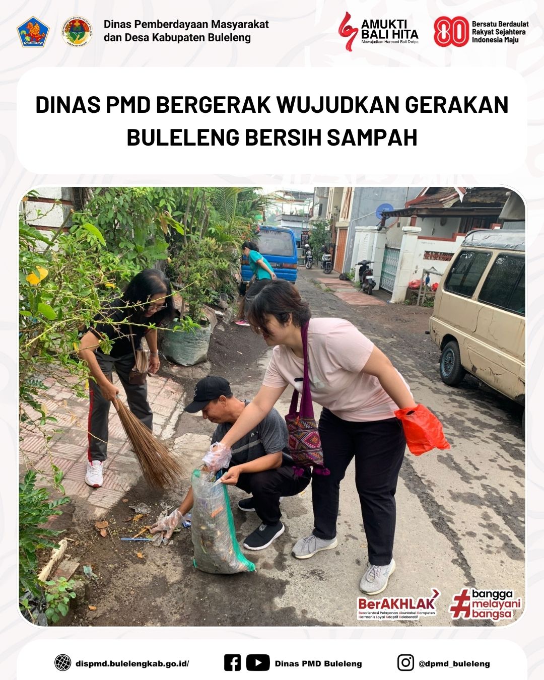 Buleleng, 31 Oktober 2025 - Menindaklanjuti Surat Bupati Buleleng tentang Gerakan Buleleng Bersih Sampah sebagai implementasi berbagai kebijakan pengelolaan sampah berbasis sumber, Dinas Pemberdayaan Masyarakat dan Desa (PMD) Kabupaten Buleleng turut ambil bagian dalam aksi nyata menjaga kebersihan lingkungan.