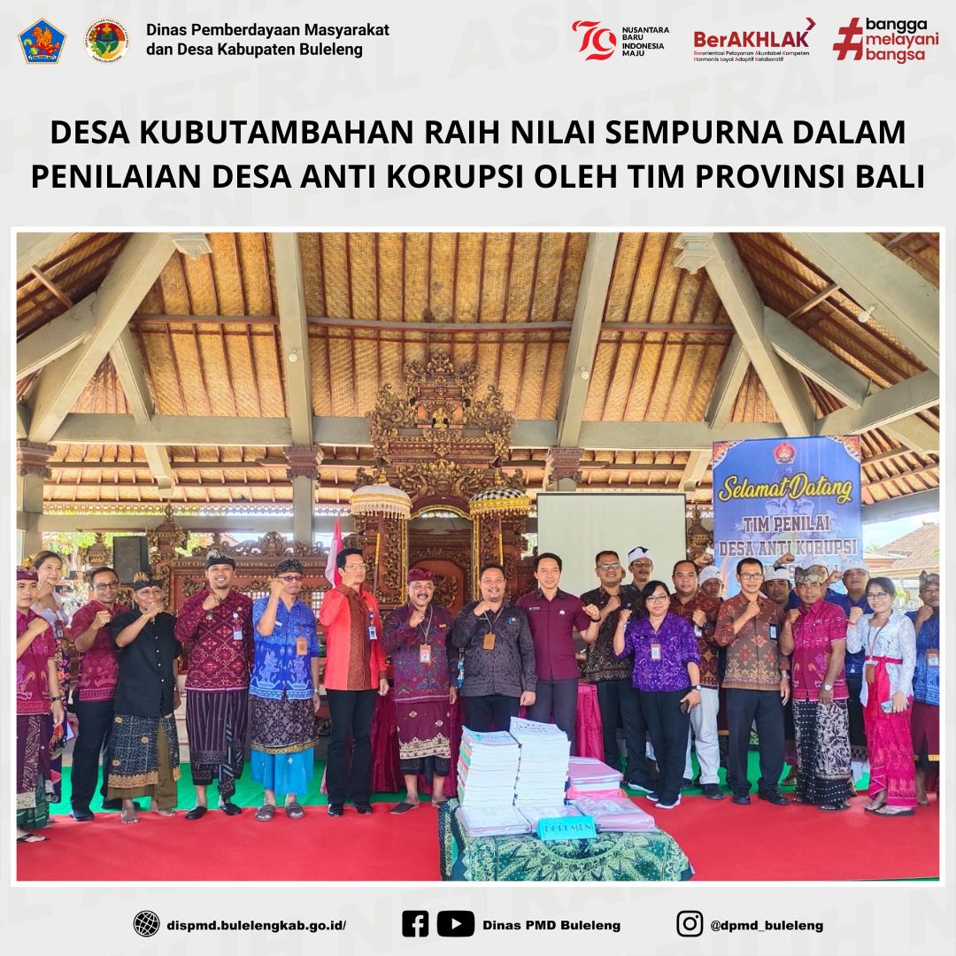 Buleleng, 22 Oktober 2024 – Desa Kubutambahan berhasil meraih nilai sempurna 100,00 dalam kegiatan Penilaian Desa Anti Korupsi yang dilakukan oleh Tim Penilai Provinsi Bali. Acara ini dihadiri oleh Plt Kepala Dinas PMD Kabupaten Buleleng, Drs. Made Supartawan, bersama Kabid Pemdes, Madong Hartono, dan staf, yang turut menyaksikan keberhasilan ini.
