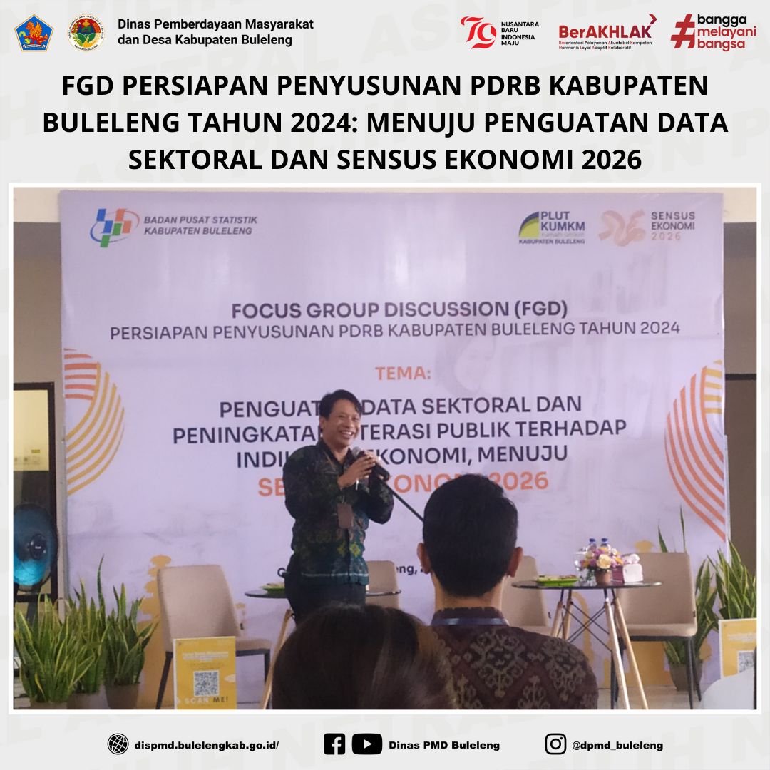 Buleleng, 20 November 2024 – Dalam upaya menyusun Produk Domestik Regional Bruto (PDRB) Kabupaten Buleleng Tahun 2024 yang lebih komprehensif, Badan Pusat Statistik (BPS) Kabupaten Buleleng mengadakan Focus Group Discussion (FGD) pada Rabu, 20 November 2024. Acara bertema "Penguatan Data Sektoral dan Peningkatan Literasi Publik terhadap Indikator Ekonomi, Menuju Sensus Ekonomi 2026" ini berlangsung di Gedung PLUT K-UMKM Kabupaten Buleleng.
