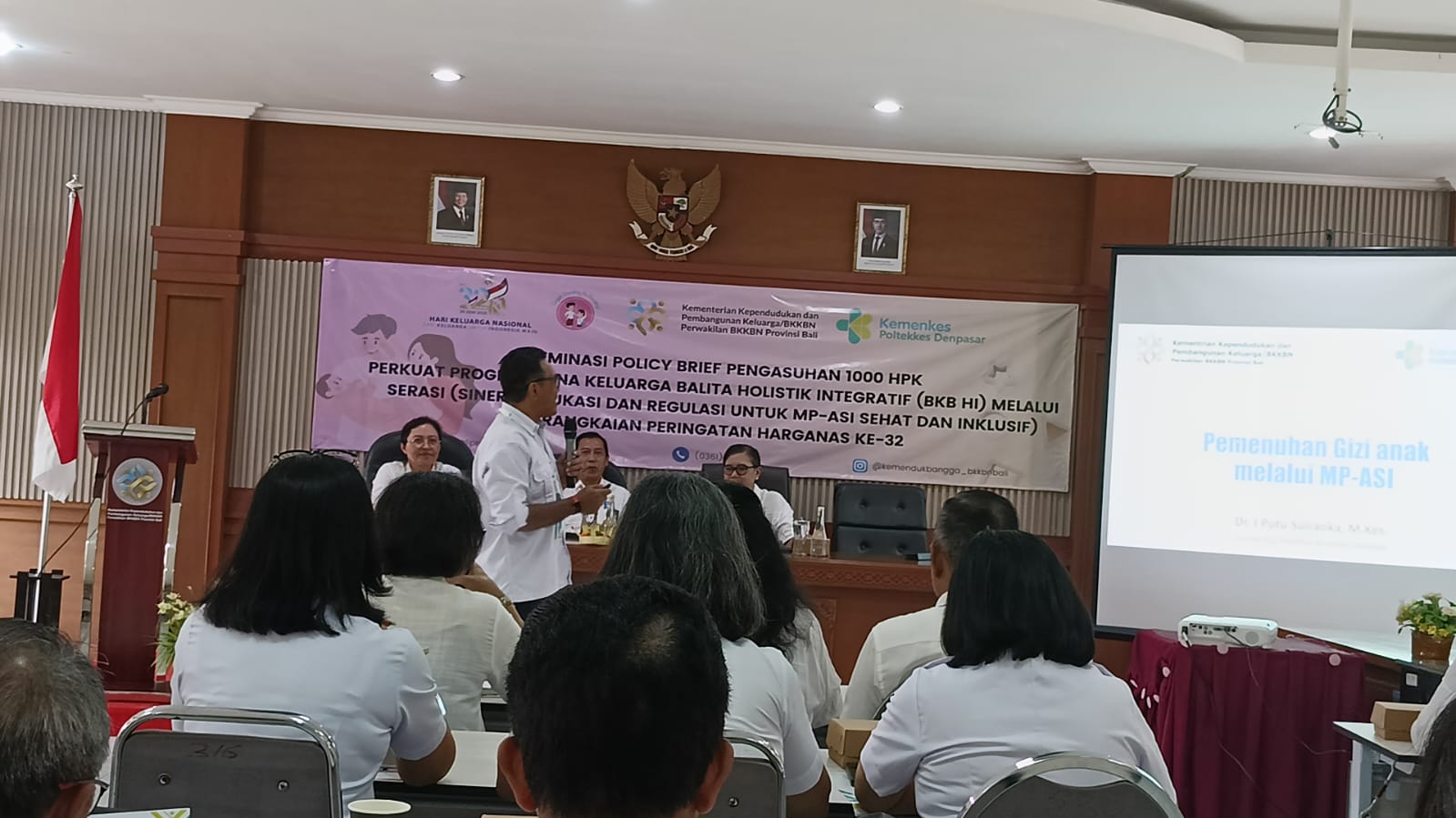 Kegiatan ini dilaksanakan dalam rangka meningkatkan komitmen para pemangku kepentingan dan mitra kerja dalam mendukung penguatan pengasuhan pada periode 1000 Hari Pertama Kehidupan (HPK). Kementerian Kependudukan dan Pembangunan Keluarga/BKKBN melalui Perwakilan BKKBN Provinsi Bali, bekerja sama dengan Politeknik Kesehatan Kemenkes Denpasar, telah menyusun Policy Brief bertajuk SERASI (Sinergi Edukasi dan Regulasi untuk MP-ASI Sehat dan Inklusif).