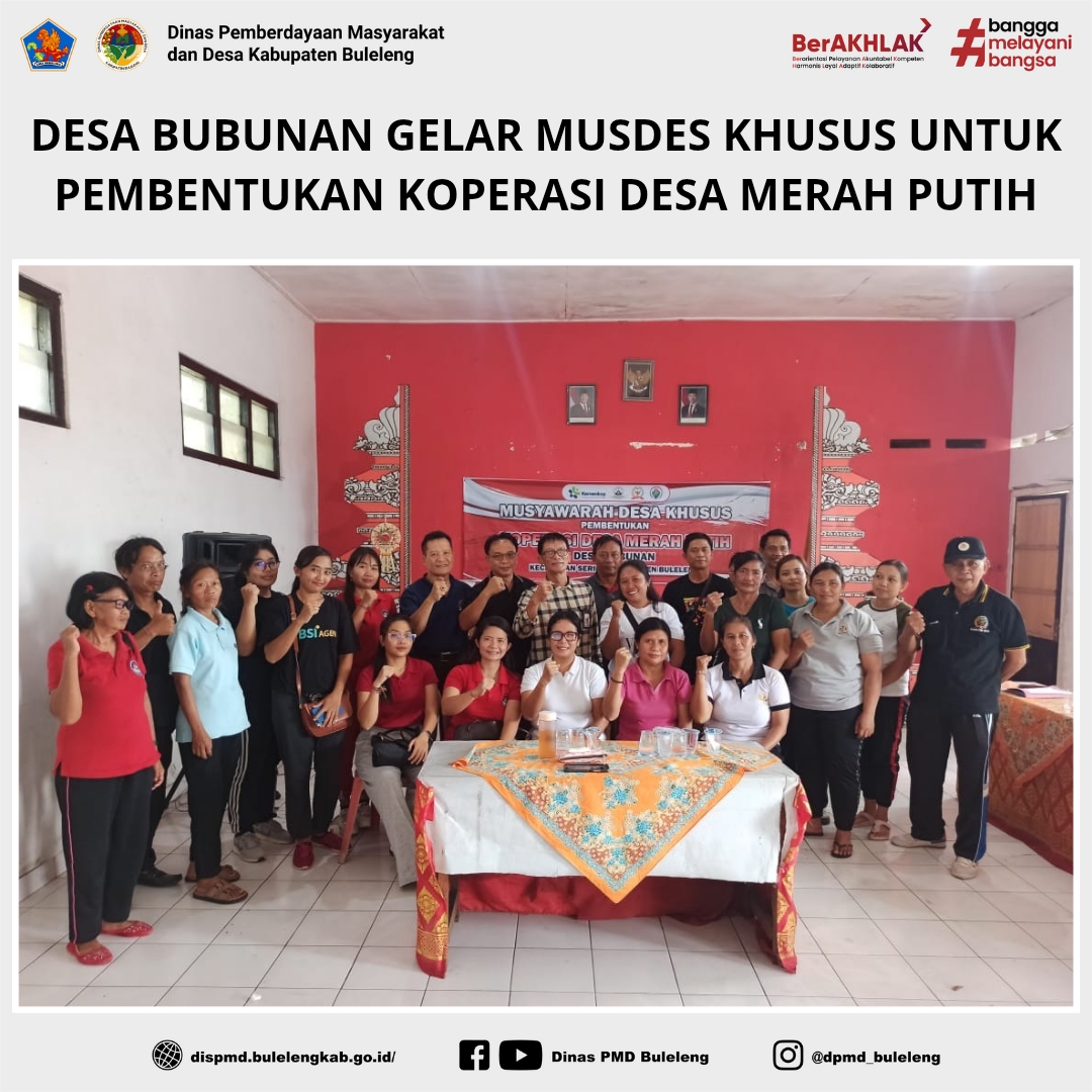 Buleleng, 16 Mei 2025 — Sebagai bagian dari implementasi Instruksi Presiden Nomor 9 Tahun 2025 tentang Percepatan Pembentukan Koperasi Desa/Kelurahan Merah Putih, Pemerintah Desa Bubunan, Kecamatan Seririt, melaksanakan kegiatan sosialisasi sekaligus Musyawarah Desa (Musdes) Khusus dalam rangka pembentukan Koperasi Desa Merah Putih pada Jumat, 16 Mei 2025, bertempat di Gedung Hita Gosana Desa Bubunan.