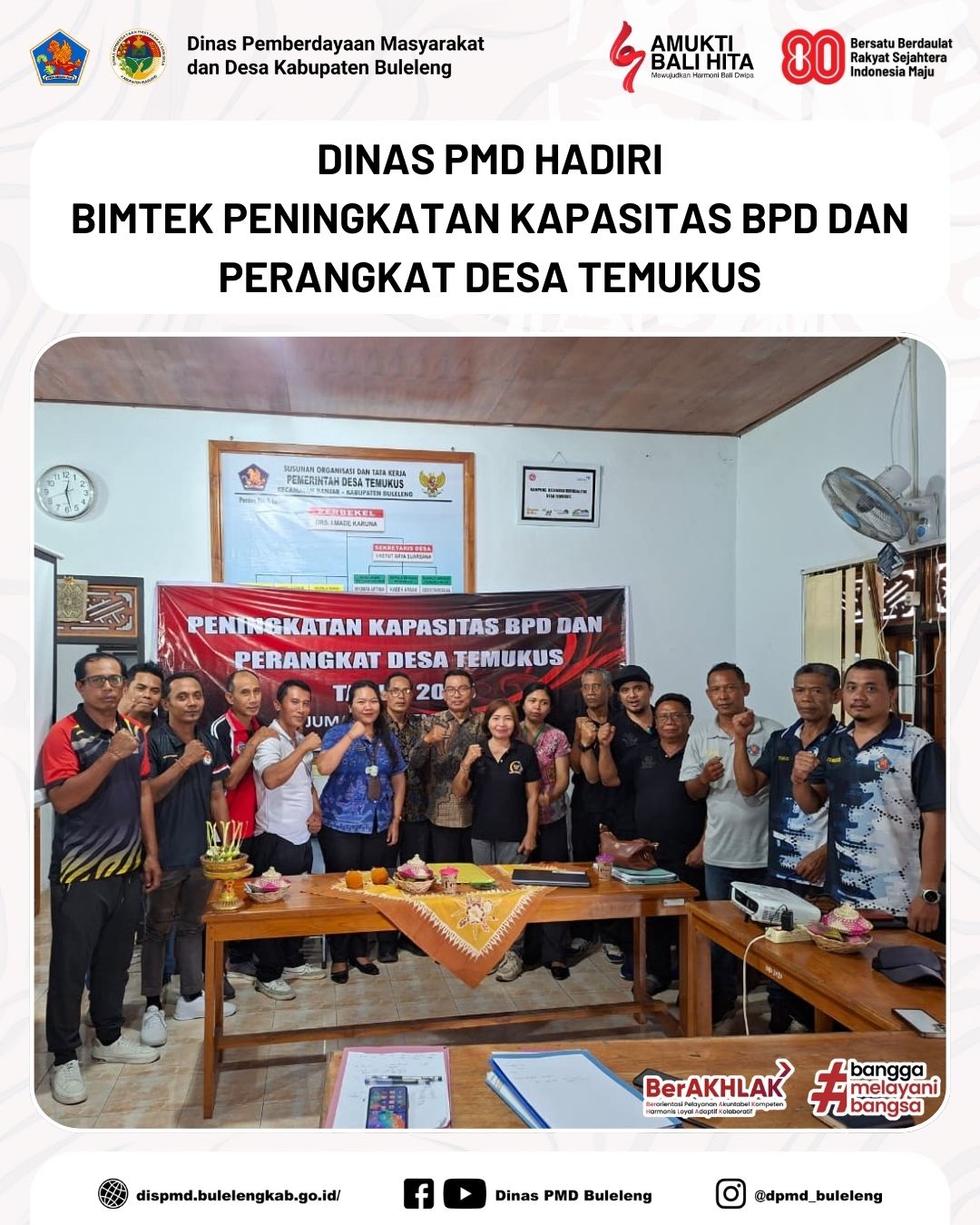 Buleleng, 12 Desember 2025 - Dinas Pemberdayaan Masyarakat dan Desa (PMD) Kabupaten Buleleng menghadiri undangan sebagai narasumber pada kegiatan Bimbingan Teknis (Bimtek) Peningkatan Kapasitas Badan Permusyawaratan Desa (BPD) dan Perangkat Desa Temukus. Dinas PMD diwakili oleh Kabid Pemerintahan Desa (Pemdes), Madong Hartono, beserta staf. Kegiatan berlangsung di Kantor Perbekel Desa Temukus, Kecamatan Banjar.