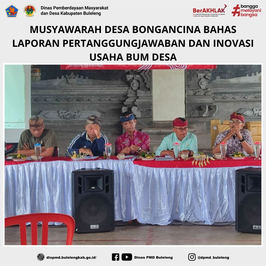 Musyawarah turut dihadiri oleh Kasi Pemerintahan Kecamatan Busungbiu selaku perwakilan Camat, Perbekel dan Perangkat Desa Bongancina, Pendamping Desa, Direktur dan Badan Pengawas serta Pengurus BUM Desa, Babinkamtibmas, Ketua LPM, Ketua BPD, serta sejumlah nasabah BUM Desa Nadi Cemerlang.