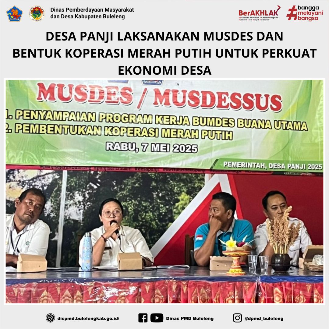 Dinas PMD Kabupaten Buleleng memberikan apresiasi atas inisiatif Pemerintah Desa Panji dalam memperkuat peran BUMDes dan membentuk Koperasi Merah Putih sebagai bagian dari pelaksanaan Instruksi Presiden Nomor 9 Tahun 2025. Langkah ini diharapkan menjadi katalisator pembangunan ekonomi desa berbasis potensi lokal dan semangat gotong royong.