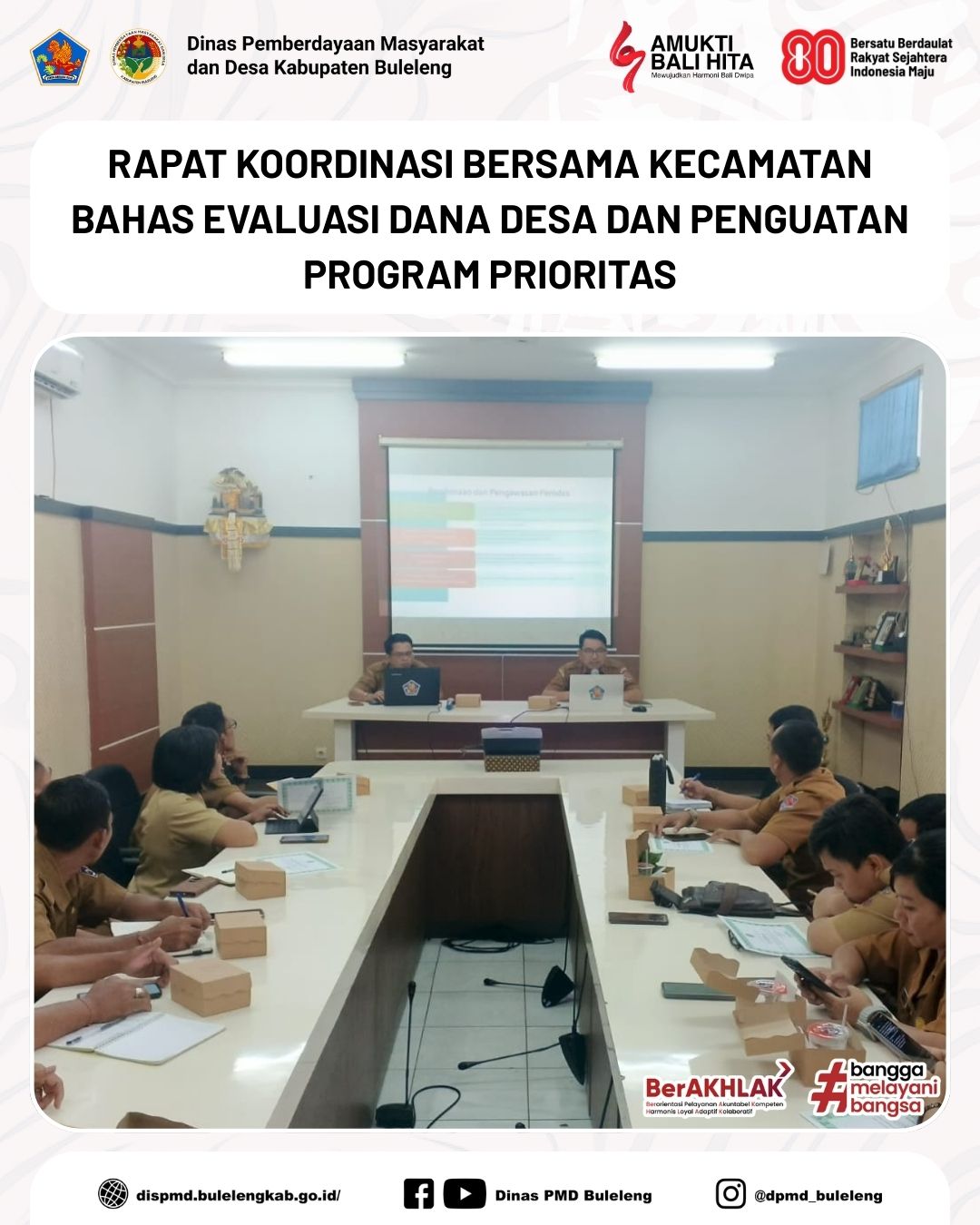 Buleleng, 15 September 2025 - Dinas Pemberdayaan Masyarakat dan Desa (PMD) Kabupaten Buleleng melalui Bidang Pemerintahan Desa (Pemdes) melaksanakan Rapat Koordinasi bersama para Camat se-Kabupaten Buleleng. Kegiatan yang berlangsung di Ruang Rapat Dinas PMD ini dihadiri oleh Supervisor Kecamatan, Kasi Pemerintahan Kecamatan, serta staf kecamatan. Rapat dibuka secara resmi oleh Kabid Pemdes, Madong Hartono, yang kemudian dilanjutkan dengan pemaparan sejumlah materi penting terkait evaluasi dan penguatan penyelenggaraan pemerintahan desa.