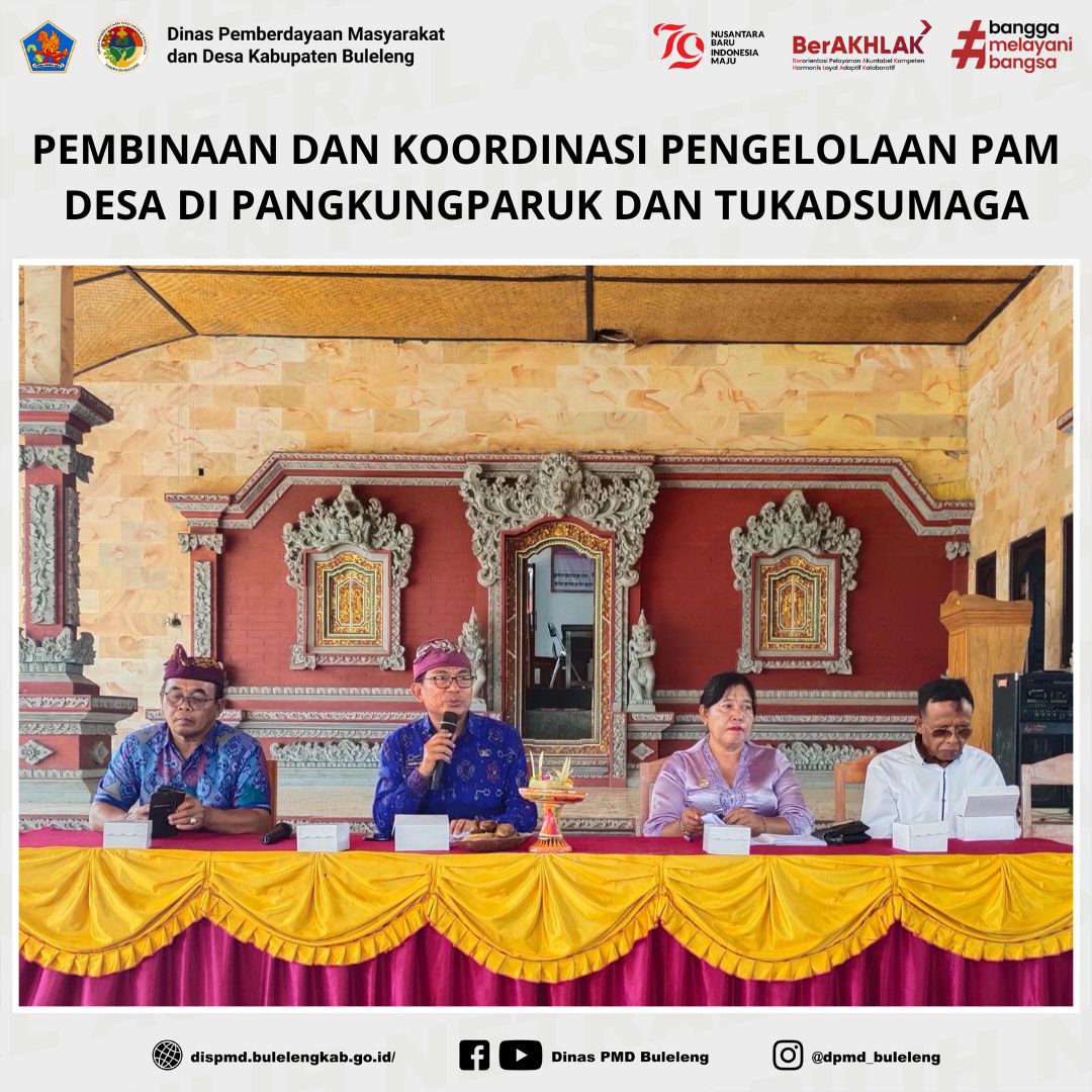 Buleleng, 21 November 2024 – Bidang Pemerintahan Desa (Pemdes) Dinas PMD Kabupaten Buleleng, yang dipimpin oleh Kepala Bidang Pemerintahan Desa, Madong Hartono, S.Pd., bersama staf, melaksanakan pembinaan dan koordinasi terkait pengelolaan Penyediaan Air Minum (PAM) Desa di dua lokasi, yaitu Kantor Perbekel Pangkungparuk dan Kantor Perbekel Tukadsumaga.