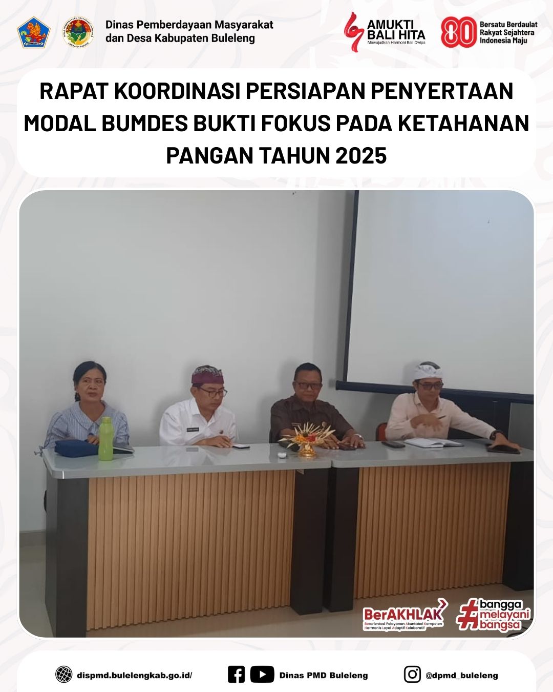 Buleleng, 22 September 2025 - Dinas Pemberdayaan Masyarakat dan Desa (PMD) Kabupaten Buleleng yang diwakili oleh Kepala Bidang Pemerintahan Desa, Madong Hartono, menghadiri rapat koordinasi persiapan pelaksanaan penyertaan modal ke Badan Usaha Milik Desa (BUMDes) Bukti Tahun 2025. Kegiatan berlangsung di Aula Kantor Desa Bukti dan dibuka oleh Sekretaris Desa Bukti.