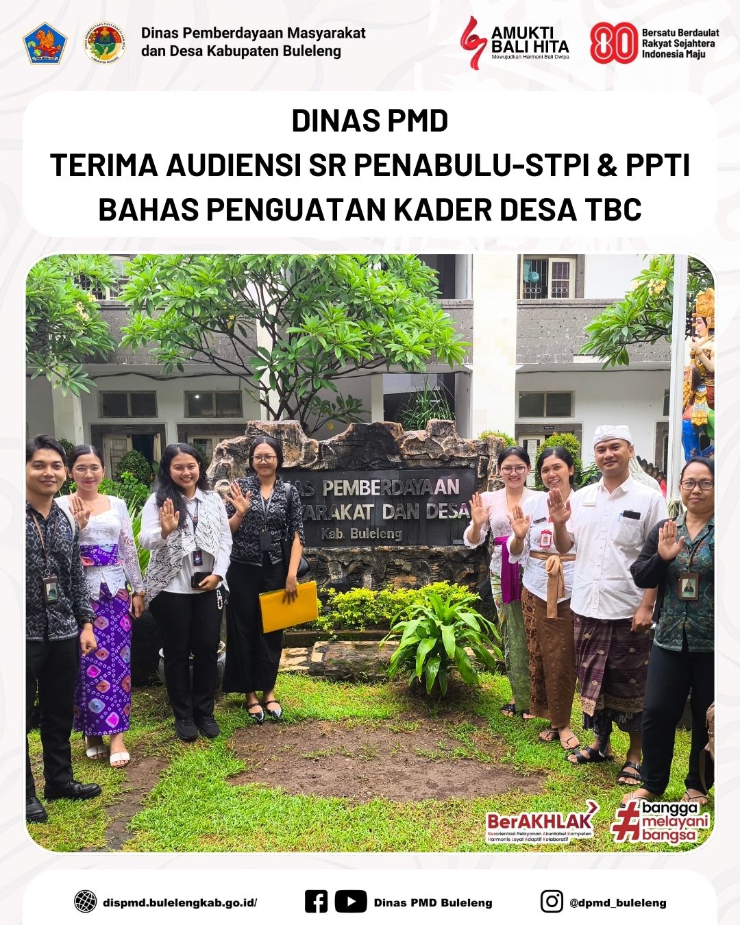 Buleleng, 19 Desember 2025 - Bertempat di Ruang Rapat Dinas PMD, Jumat (19/12), Plt. Sekretaris Dinas PMD Kabupaten Buleleng, I Rai Gede Arisudana, didampingi Fungsional Penggerak Swadaya Masyarakat (PSM) Ngurah Putu Adnyana serta staf Bidang Pemerintahan Desa, menerima kunjungan audiensi dari SR Konsorsium Komunitas Penabulu-STPI Provinsi Bali yang bekerja sama dengan Perkumpulan Pemberantas Tuberkulosis Indonesia (PPTI). Audiensi ini membahas peluang kerja sama dalam pelaksanaan Program TBC berbasis komunitas yang memerlukan keterlibatan kader desa di wilayah kerja Puskesmas Buleleng III dan wilayah lainnya, dengan target setiap desa memiliki kader TBC.