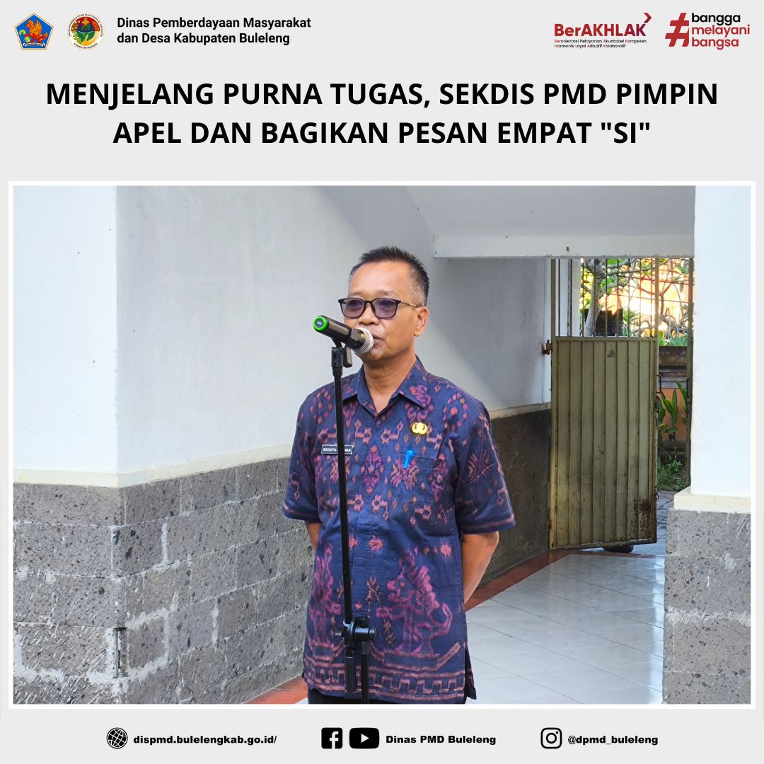 Buleleng, 29 April 2025 — Menjelang masa purna baktinya, Gede Sasnita Ariawan selaku Sekretaris Dinas (Sekdis) PMD Kabupaten Buleleng memimpin apel pagi yang dilaksanakan pada Senin (29/4) di halaman kantor Dinas PMD Kabupaten Buleleng. Apel tersebut diikuti oleh seluruh pejabat struktural dan pegawai di lingkungan Dinas PMD Kabupaten Buleleng.
