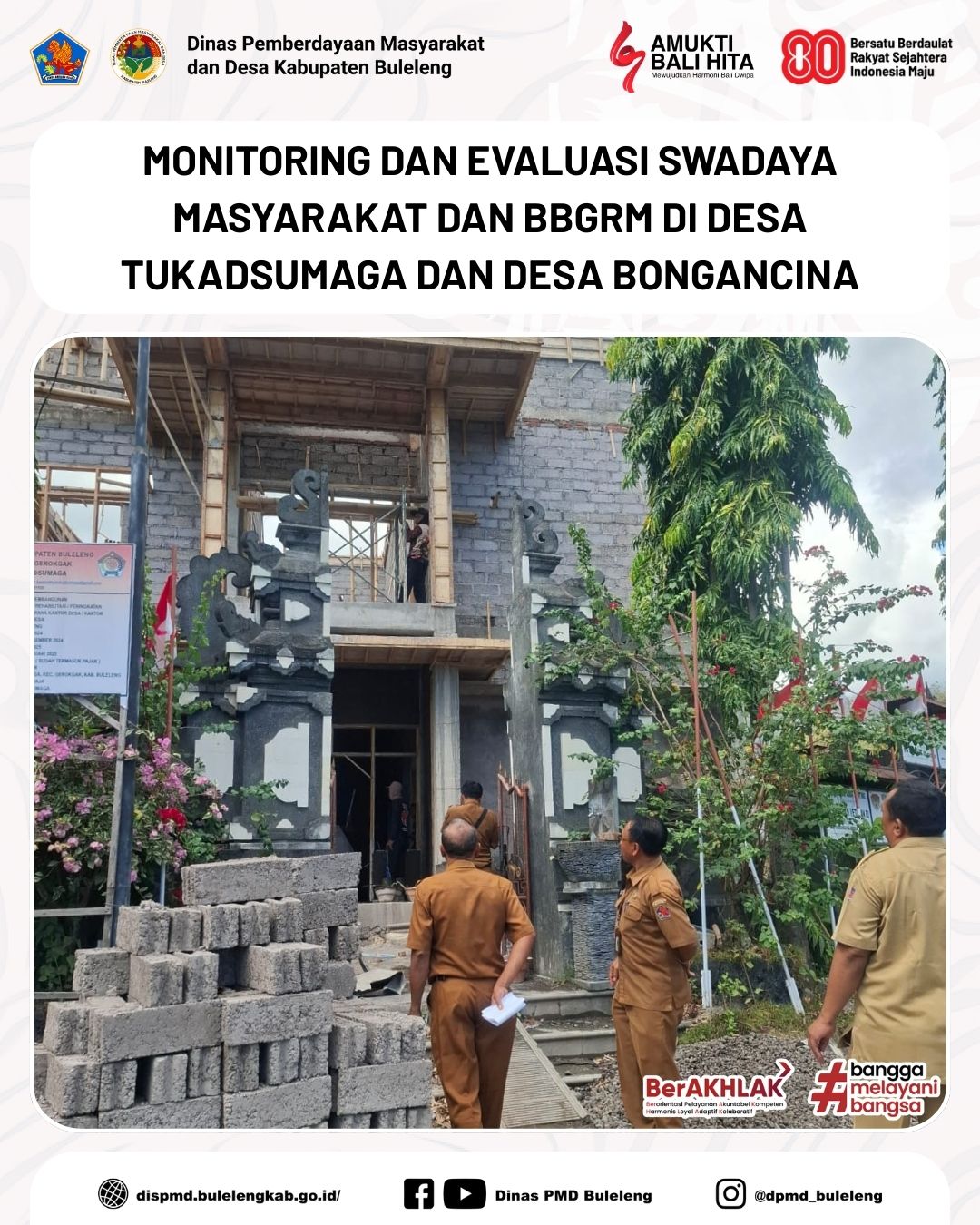 Buleleng, 15 September 2025 - Dinas Pemberdayaan Masyarakat dan Desa (PMD) Kabupaten Buleleng melalui Bidang Lembaga Kemasyarakatan Desa, Adat dan Usaha Ekonomi Masyarakat (LKDA UEM) melaksanakan kegiatan Monitoring dan Evaluasi (Monev) Pelaporan Swadaya Murni Masyarakat, Bantuan Penunjang, serta Bulan Bhakti Gotong Royong Masyarakat (BBGRM). Kegiatan ini dilaksanakan di dua desa, yakni Desa Tukad Sumaga Kecamatan Gerokgak dan Desa Bongancina Kecamatan Busungbiu.