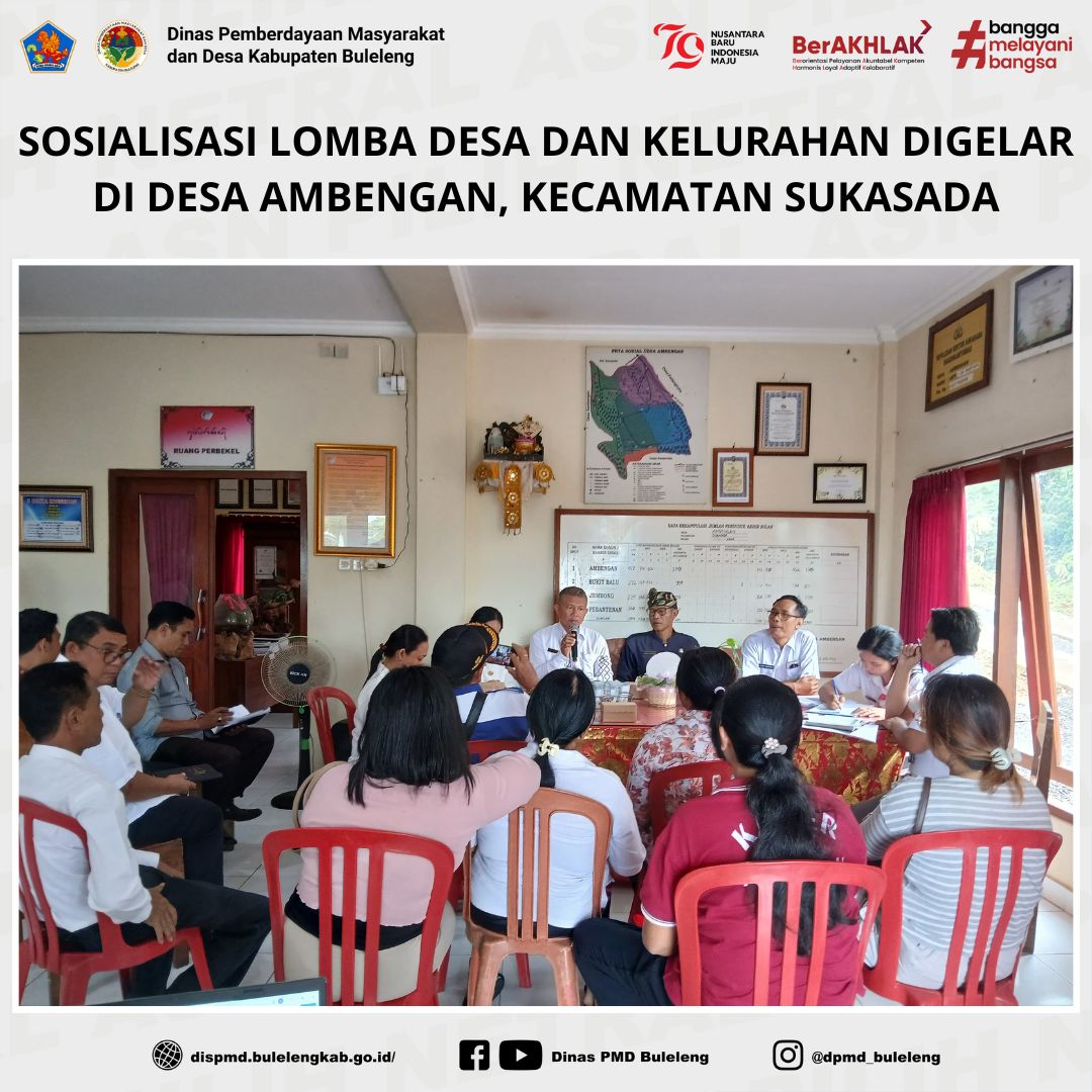 Buleleng, 18 Desember 2024 - Rangkaian sosialisasi Lomba Desa dan Kelurahan Tingkat Kabupaten Buleleng Tahun 2025 berlanjut ke Kecamatan Sukasada pada Rabu, 18 Desember 2024. Kegiatan ini dilaksanakan di Desa Ambengan, yang menjadi perwakilan Kecamatan Sukasada.