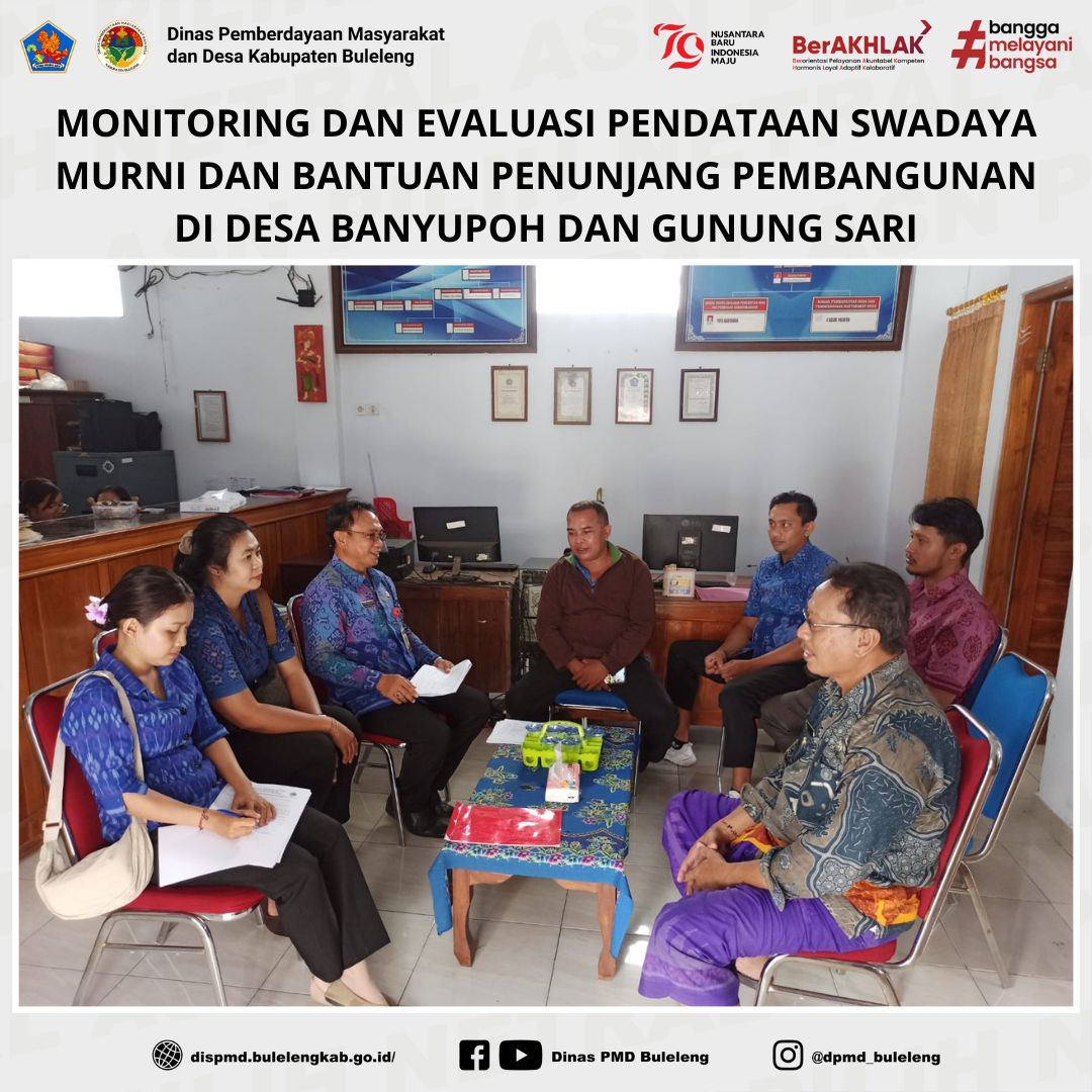 Buleleng, 12 November 2024 - Dinas Pemberdayaan Masyarakat dan Desa (PMD) Kabupaten Buleleng, melalui Bidang Lembaga Kemasyarakatan Desa, Adat dan Usaha Ekonomi Masyarakat (LKDA UEM), menggelar kegiatan monitoring dan evaluasi (monev) Pendataan Laporan Swadaya Murni dan Bantuan Penunjang Pembangunan. Kegiatan yang dipimpin oleh Fungsional Penggerak Swadaya Masyarakat (PSM), Dewa Nyoman Suarjana Putra, beserta staf ini dilaksanakan untuk hari pertama di Desa Banyupoh, Kecamatan Gerokgak, dan Desa Gunung Sari, Kecamatan Seririt.