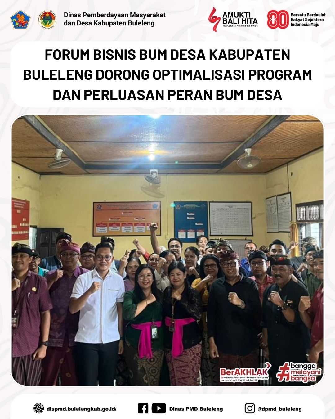 Buleleng, 27 November 2025 - Dinas Pemberdayaan Masyarakat dan Desa (PMD) melalui Bidang Pemerintahan Desa (Pemdes) memfasilitasi pelaksanaan Forum Bisnis BUM Desa Kabupaten Buleleng yang digelar di Aula Kantor Perbekel Desa Panji, Kecamatan Sukasada. Kegiatan ini menghadirkan peserta dari berbagai unsur kelembagaan desa dan pemangku kepentingan pengembangan BUM Desa di Kabupaten Buleleng.