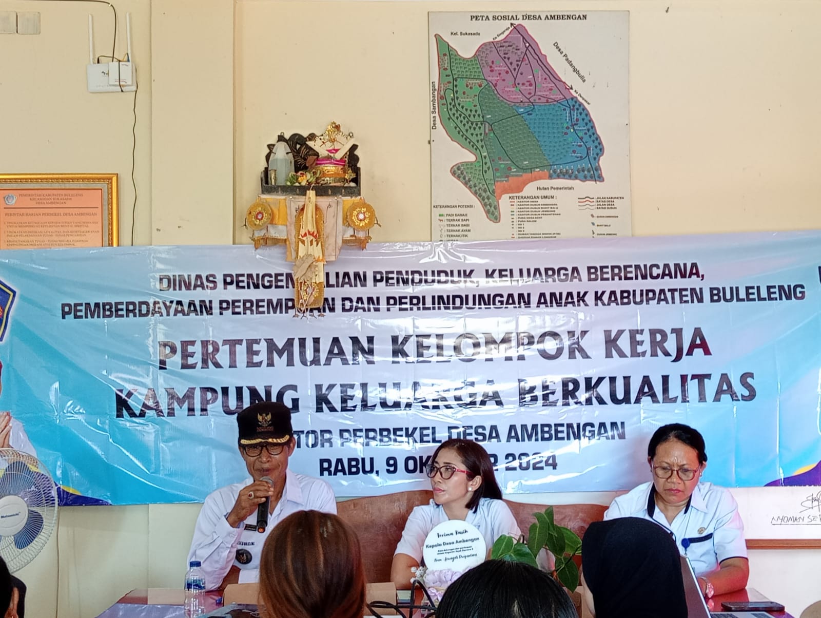 Bertempat di Kantor Perbekel Desa Ambengan Kecamatan Sukasada, Bidang Pengendalian Penduduk, Penyuluh dan Penggerakan Dinas Pengendalian Penduduk Keluarga Berencana Pemberdayaan Perempuan dan Perlindungan Anak Kabupaten Buleleng melaksanakan. Pertemuan Kelompok Kerja Kampung Keluarga Berkualitas di Desa Ambengan Kec. Sukasada terkait Sosialisasi Instruksi Presiden Republik Indonesia Nomor 3 Tahun 2022 Tentang "Pertemuan Kelompok Kerja Kampung KB" dalam rangka Pembinaan Penyusunan Rencana Kerja Masyarakat dan Pengisian Pelaporan variabel data pada Website Kampung Keluarga Berkualitas, demi tujuan terbentuknya Kampung keluarga Berkualitas (Kampung KB) yaitu meningkatkan Kualitas Hidup Masyarakat melalui keterpaduan Program Pembangunan Keluarga, Kependudukan dan Keluarga Berencana dengan Program Stake Holder terkait. Panitia Kabupaten akan memberikan Konsumsi serta Uang Transport.
