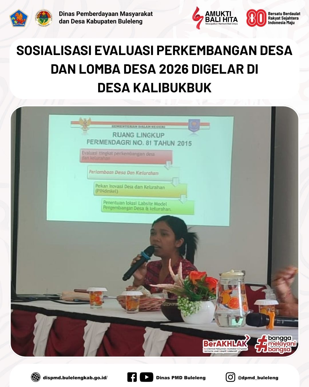 Buleleng, 24 Oktober 2025 - Dinas Pemberdayaan Masyarakat dan Desa (PMD) Kabupaten Buleleng melalui Bidang Pemerintahan Desa kembali melaksanakan kegiatan Sosialisasi Evaluasi Perkembangan Desa dan Perlombaan Desa/Kelurahan tingkat Kabupaten Buleleng tahun 2026. Kegiatan kali ini berlangsung di Desa Kalibukbuk, Kecamatan Buleleng, pada Jumat (24/10).