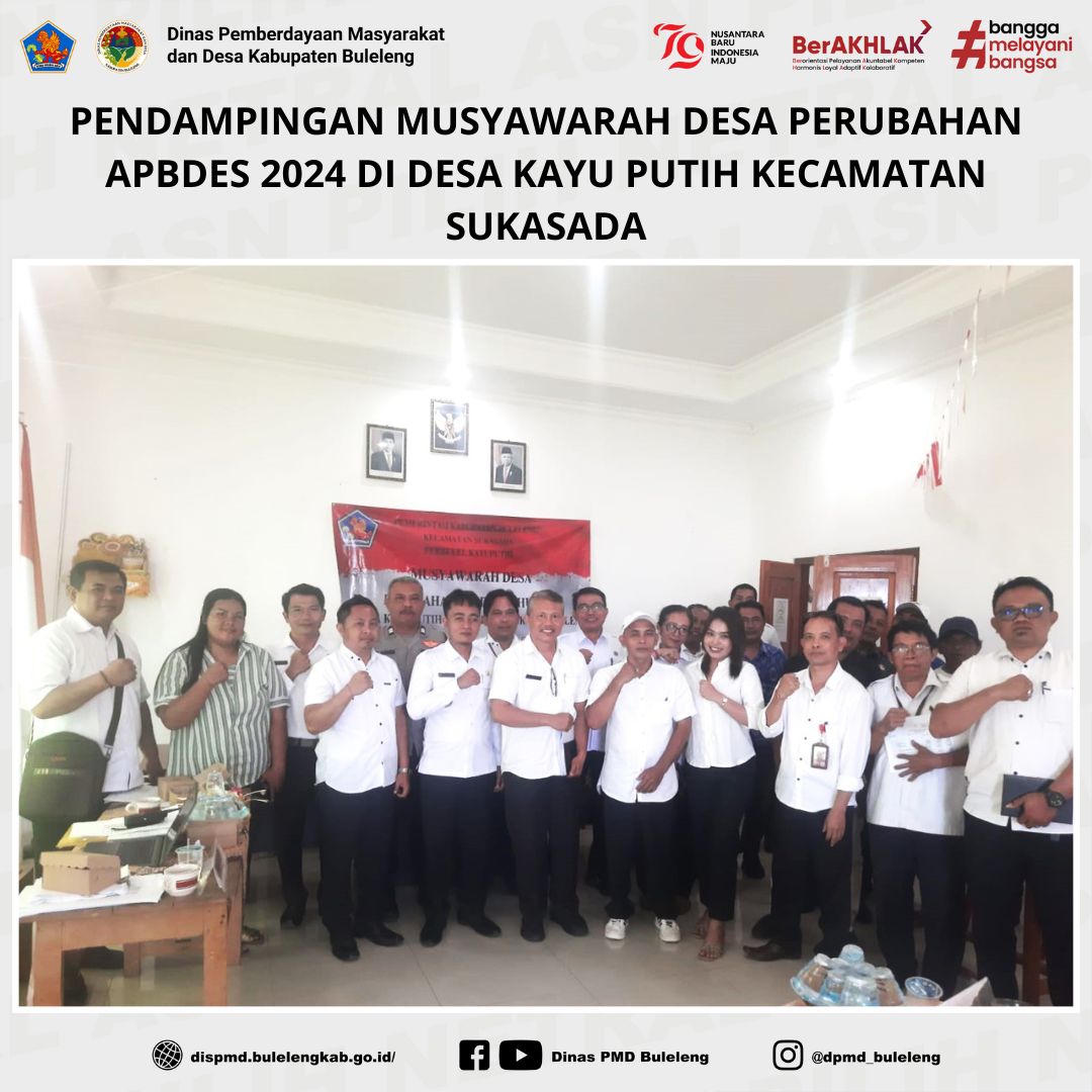 Buleleng, 6 November 2024 – Dinas Pemberdayaan Masyarakat dan Desa (PMD) Kabupaten Buleleng melalui Kepala Bidang Pemerintahan Desa, Madong Hartono, melaksanakan pendampingan dalam Musyawarah Desa (Musdes) terkait perubahan Anggaran Pendapatan dan Belanja Desa (APBDes) Tahun 2024 di Desa Kayu Putih, Kecamatan Sukasada. Kegiatan ini berlangsung di Ruang Rapat Kantor Desa Kayu Putih dan dihadiri oleh jajaran pemerintahan desa dan kecamatan setempat.