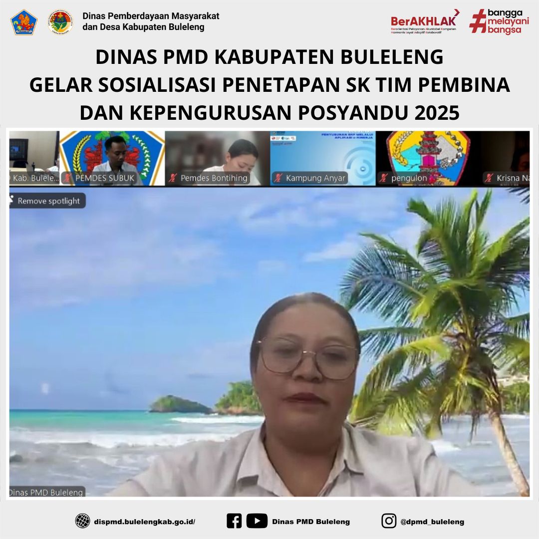 Buleleng, 26 Maret 2025 – Dinas Pemberdayaan Masyarakat dan Desa (PMD) Kabupaten Buleleng melalui Bidang Lembaga Kemasyarakatan Desa, Adat, dan Usaha Ekonomi Masyarakat (LKDA UEM) menggelar Sosialisasi Penetapan SK Tim Pembina Posyandu dan Kepengurusan Posyandu Desa/Kelurahan Tahun 2025. Kegiatan ini dilaksanakan secara daring melalui Zoom Meeting pada Rabu, 26 Maret 2025.