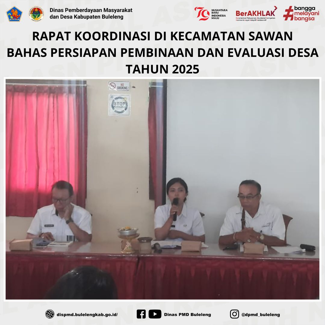 Buleleng, 22 Januari 2025 — Dalam rangka mempersiapkan pembinaan dan evaluasi perkembangan desa tahun 2025, Dinas Pemberdayaan Masyarakat dan Desa (PMD) Kabupaten Buleleng menghadiri undangan rapat koordinasi yang berlangsung di Aula Kantor Camat Sawan. Kegiatan ini dilaksanakan oleh Kantor Camat Sawan dan dihadiri oleh berbagai pihak terkait.