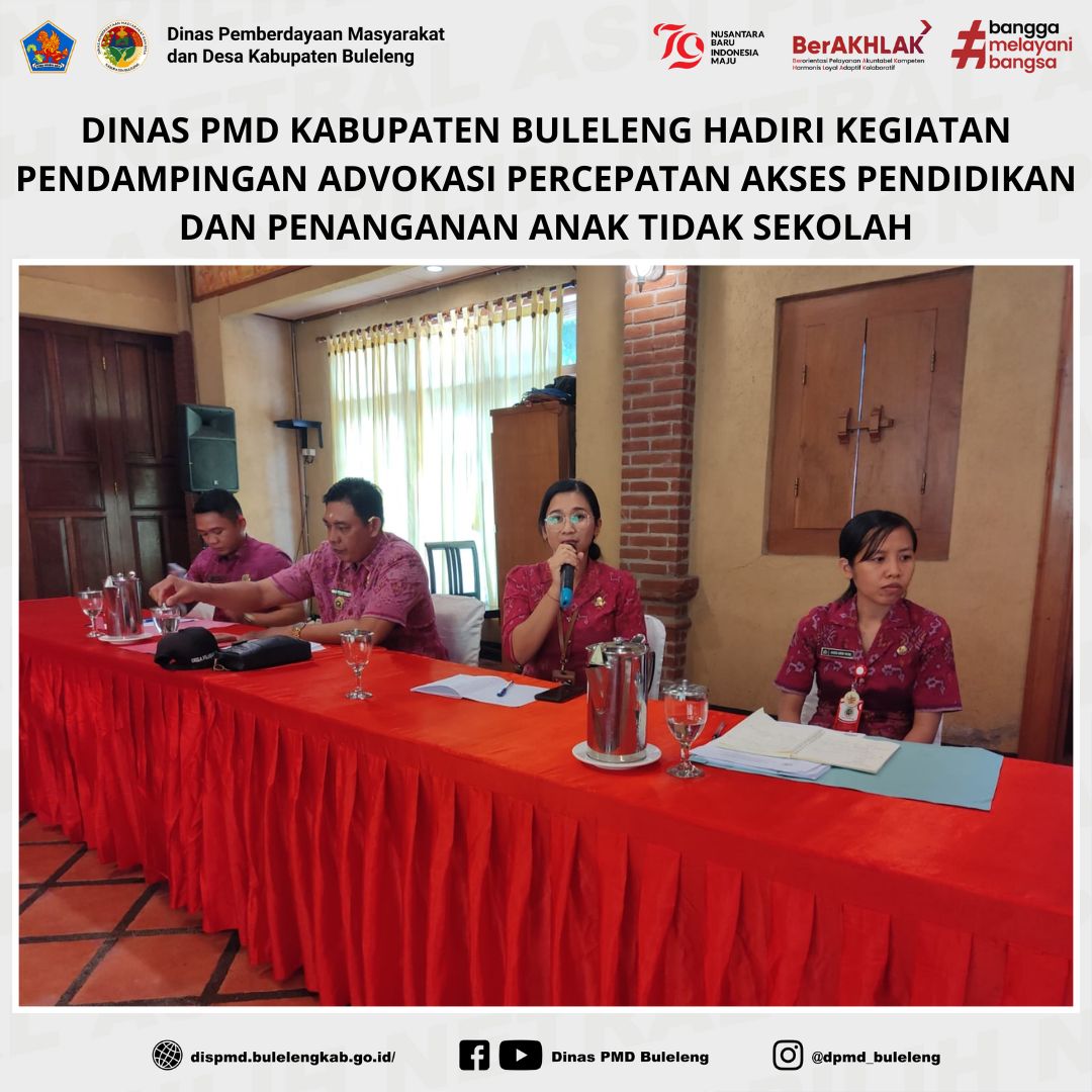 Buleleng, 15 Oktober 2024 – Dinas Pemberdayaan Masyarakat dan Desa (PMD) Kabupaten Buleleng, yang diwakili oleh staf Ni Kadek Heny Suriyani, turut menghadiri kegiatan Pendampingan Advokasi Percepatan Akses AKS, APK, APS, serta penanganan Anak Tidak Sekolah (ATS). Kegiatan ini berlangsung di Hotel Banyualit Spa 'n Resort Lovina, dan melibatkan berbagai pihak terkait untuk menangani masalah pendidikan di Kabupaten Buleleng.
