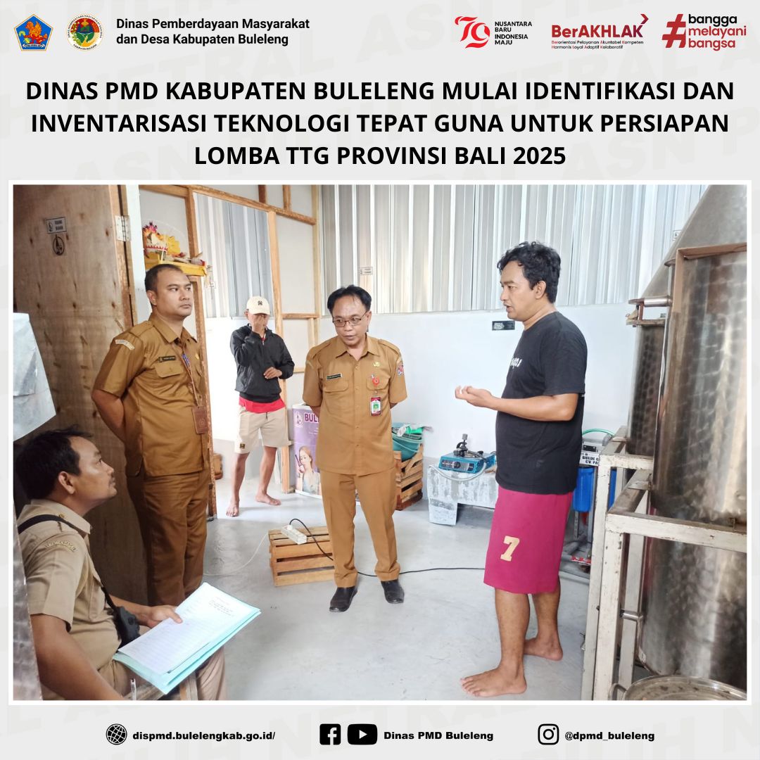 Buleleng, 4 November 2024 – Bidang Lembaga Kemasyarakatan Desa, Adat, dan Usaha Ekonomi Masyarakat (LKDA-UEM) Dinas PMD Kabupaten Buleleng, yang diwakili oleh Fungsional Penggerak Swadaya Masyarakat (PSM), Dewa Nyoman Suarjana Putra dan Ngurah Putu Adnyana, melaksanakan kegiatan Identifikasi dan Inventarisasi Pemanfaatan Teknologi Tepat Guna (TTG) sebagai bagian dari persiapan lomba TTG tingkat Provinsi Bali tahun 2025.