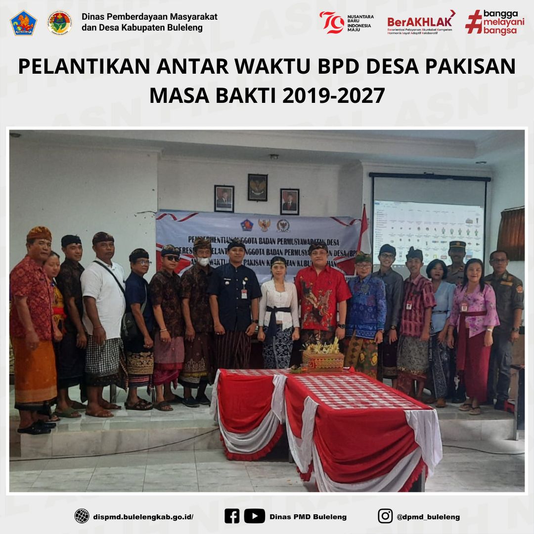 Buleleng, 23 Januari 2025 – Pelantikan antar waktu Badan Permusyawaratan Desa (BPD) Desa Pakisan, Kecamatan Kubutambahan, untuk masa bakti 2019-2027 berlangsung hari ini di Aula Kantor Camat Kubutambahan. Prosesi pelantikan dilakukan langsung oleh Camat Kubutambahan dengan khidmat.