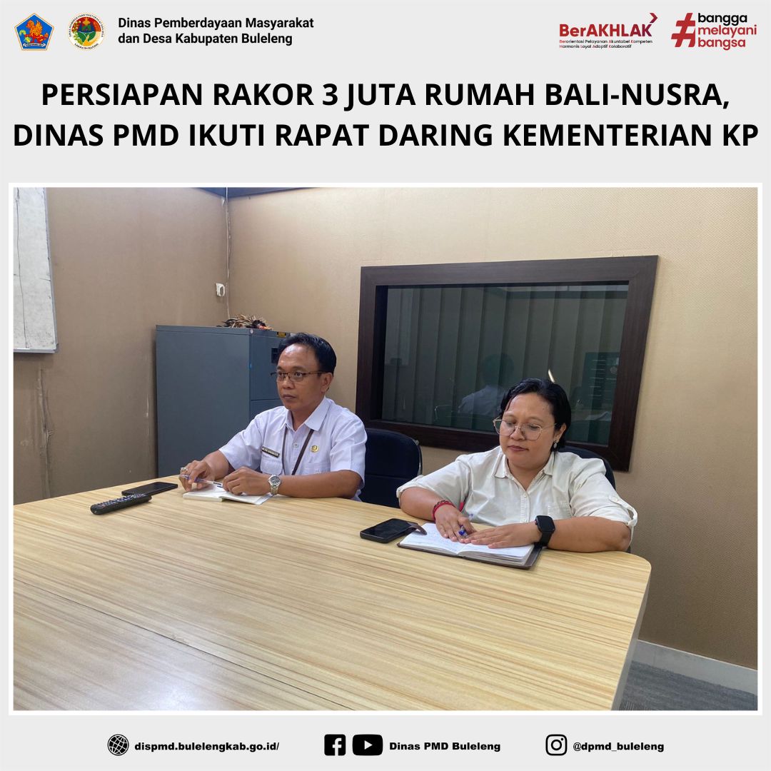 Buleleng, 16 Juli 2025 - Dinas Pemberdayaan Masyarakat dan Desa (PMD) Kabupaten Buleleng, melalui Kepala Bidang Lembaga Kemasyarakatan Desa, Adat dan Usaha Ekonomi Masyarakat (LKDA-UEM), Ni Made Banu Deviati, didampingi Fungsional Penggerak Swadaya Masyarakat, Dewa Nyoman Suarjana Putra, mengikuti rapat daring melalui Zoom Meeting pada Rabu, 16 Juli 2025. Rapat ini merupakan agenda persiapan Rapat Koordinasi (Rakor) 3 Juta Rumah wilayah Bali-Nusra yang digagas oleh Kementerian Perumahan dan Kawasan Permukiman (KP), Direktorat Jenderal Perumahan Perdesaan.