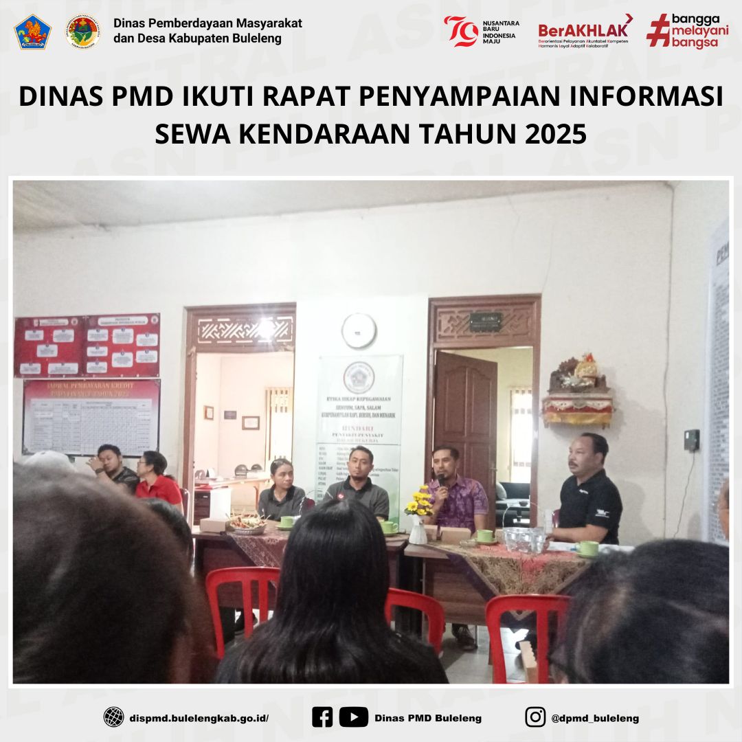 Buleleng, 13 Desember 2024 – Kasubbag Umum Dinas PMD Kabupaten Buleleng, Made Desi Widiarsini, S.E., menghadiri rapat yang membahas penyampaian informasi terkait sewa kendaraan tahun 2025 di Kantor Perumda Swatantra Kabupaten Buleleng. Rapat ini dipimpin langsung oleh Direktur Utama Perumda Swatantra Kabupaten Buleleng dan dihadiri perwakilan dari berbagai OPD.