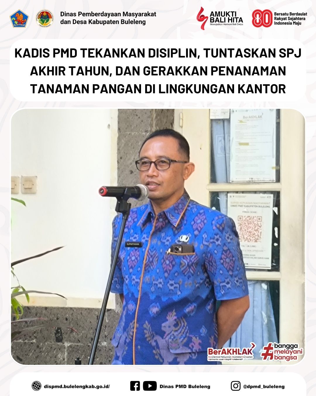 Buleleng, 9 Desember 2025 - Kadis Pemberdayaan Masyarakat dan Desa (PMD) Kabupaten Buleleng, Made Supartawan, hari ini memimpin apel pagi di halaman kantor Dinas PMD. Dalam arahannya, beliau menyampaikan sejumlah hal penting terkait disiplin, realisasi keuangan, dan gerakan penanaman tanaman pangan di lingkungan kantor.