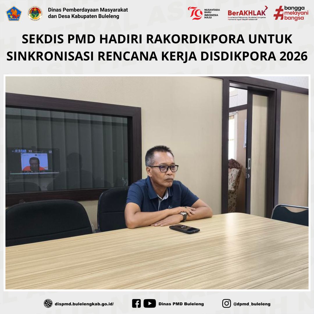 Buleleng, 28 Februari 2025 – Sekretaris Dinas Pemberdayaan Masyarakat dan Desa (PMD) Kabupaten Buleleng, Gede Sasnita Ariawan, menghadiri Rapat Koordinasi Pendidikan, Pemuda, dan Olahraga (Rakordikpora) Kabupaten Buleleng Tahun 2026 yang diselenggarakan secara virtual melalui Zoom Meeting pada Jumat, 28 Februari 2025.